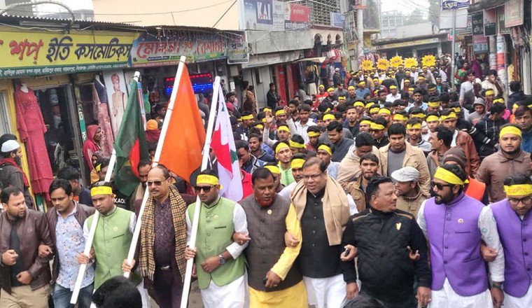নিজস্ব প্রতিবেদক : গতকাল সোমবার নানা কর্মসূচী, উৎসাহ-উদ্দীপনা আর উৎসবমূখর পরিবেশের মধ্য দিয়ে সিরাজগঞ্জ জেলার শাহজাদপুরে বাংলাদেশ ছাত্রলীগের ৭২তম প্রতিষ্ঠা বার্ষিকী পালিত হয়েছে। ছাত্রলীগের প্রতিষ্ঠা উপজেলা ছাত্রলীগের পক্ষ থেকে দিনব্যাপি নানা কর্মসূচির আয়োজন করা হয়। সকালে দলীয় কার্যালয়ে জাতীয় ও দলীয় পতাকা উত্তোল এবং জাতির জনক বঙ্গবন্ধু শেখ মুজিবুর রহমানের প্রতিকৃতিতে পুষ্পস্তর্বক অর্পণের মধ্যে দিয়ে দিনের কর্মসূচি শুরু হয়। সকালে শাহজাদপুর উপজেলা আওয়ামী লীগ দলীয় কার্যালয় থেকে এক বর্ণাঢ্য শোভাযাত্রা বের হয়ে পৌর এলাকার বিভিন্ন সড়ক প্রদক্ষিণ করে। শোভাযাত্রা শেষে শাহজাদপুর সরকারি মডেল পাইলট উচ্চ বিদ্যালয় মাঠের মুক্ত মঞ্চে আলোচনা সভা ও জন্ম বার্ষিকীর কেক কাটা হয়। শাহজাদপুর উপজেলা ছাত্রলীগ সভাপতি মারুফ হাসান সুনানের সভাপতিত্বে অনুষ্ঠিত আলোচনা সভায় প্রধান অতিথি হিসেবে উপস্থিত ছিলেন স্থানীয় সংসদ সদস্য ও উপজেলা আওয়ামী লীগ সভাপতি আলহাজ্ব হাসিবুর রহমান স্বপন। বিশেষ অতিথি হিসেবে উপস্থিত ছিলেন , উপজেলা আওয়ামী লীগের যুগ্ম-সাধারণ সম্পাদক সাইফুল ইসলাম ও কোষাধ্যক্ষ আলহাজ্ব আব্দুস সালাম ব্যাপারী। উক্ত আলোচনা সভায় অন্যান্যদের মধ্যে বক্তব্য রাখেন, পৌর আওয়ামী লীগের সাধারণ সম্পাদক আমিরুল ইসলাম শাহু, ছাত্রলীগ সাধারণ সম্পাদক শেখ মোহাম্মদ রাসেল, পৌর ছাত্রলীগ সভাপতি রানা, সাধারণ সম্পাদক অনিক আকন্দ প্রমুখ। আলোচনা সভা শেষে প্রতিষ্ঠা বার্ষিকীর কেক কাটা হয়। পরে শাহজাদপুর মডেল পাইলট উচ্চ বিদ্যালয় মাঠে মনোজ্ঞ এক সাংস্কৃতিক অনুষ্ঠান অনুষ্ঠিত হয়।
