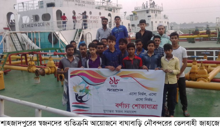 ম. জাহান, নূর মোহাম্মদ মেঘ, তাকিবুন্নাহার তাকিঃ বাঘাবাড়ি নৌবন্দরের তেলবাহী জাহাজের উপর রোববার বিকেলে গল্প কবিতা আর আনন্দ আড্ডায় পালিত হল দৈনিক যুগান্তর ও স্বজন সমাবেশের ১৮ বছরে পদার্পণ উৎসব। সিরাজগঞ্জের শাহজাদপুর উপজেলা স্বজন সমাবেশ এ উৎসবের আয়োজন করে। বর্ণাঢ্য ও ব্যতিক্রমি এ আয়োজনের মধ্যমনি ছিলেন, যুগান্তরের সাংবাদিক, বিশিষ্ট কবি, নাট্যকার ও মঞ্চ অভিনেতা মোঃ মুমীদুজ্জামান জাহান। এ আনন্দ আড্ডায় স্বজন বন্ধুদের মধ্যে উপস্থিত ছিলেন, শাহবাজ খান সানি, মেহেদী হাসান হিমু, নুরুল ইসলাম নাহিদ, আহাদুল ইসলাম আবির, সানোয়ার হেসেন, এহসানুল হক আবির, মাহমুদুল হাসান সমুদ্র, জয় মাহমুদ, রিমন, রনি, মারুফ হেসেন, হাবিব, তামিম, মনির, রহিম, ইকরামুল হক, সাব্বির, বিপ্লব সাহা, রাহুল, রতন, তাপস প্রমূখ। এদিন বিকেলে সবাই একে একে শাহজাদপুর সরকারি কলেজ শহীদ মিনারে এসে প্রথমে সমবেত হয় এরপর সিএনজি টেম্পু যোগে শাহজাদপুর শহরের ৬ কিলোমিটার দুরে অবস্থিত বাঘাবাড়ি নৌবন্দরের এক নং জেটিতে নোঙ্গর করে রাখা তেলবাহী জাহাজের উপর বসে এ আনন্দ আড্ডা পালন করা হয়। এ সময় স্বজন বন্ধুদের একের পর এক কবিতা গল্প আর কৌতুক পরিবেশনে আড্ডা ব্যাপক জমে ওঠে। সন্ধ্যার লাল সুর্য্য যখন পশ্চিম আকাশে হেলে পড়ে তখন সবাই এ আড্ডা সাঙ্গ করে ফিরে যায় যে যার আপন ঠিকানায়। আর এর মধ্য দিয়ে শেষ হয় দৈনিক যুগান্তর ও স্বজন সমাবেশের ১৮ বছরে পদার্পণ উৎসবের আনন্দ আড্ডার।
