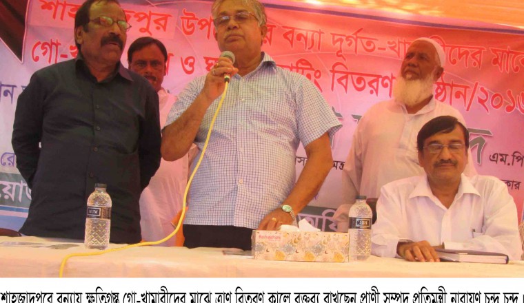 নিজস্ব সংবাদদাতা:: মৎস্য ও প্রানী সম্পদ প্রতিমন্ত্রী নারায়ণ চন্দ্র চন্দ বলেছেন, বর্তমান সরকার যে কোন দুর্যোগে জনগনের পাশে আছে এবং ভবিষ্যতেও থাকবে। তিনি আরো বলেন, বিএনপি-জামাত এই ভয়াবহ বন্যায় ক্ষতিগ্রস্ত মানুষের পাশে নেই। শুধু ঘরে বসে জনগনের কথা ভাবলে চলবেনা। আওয়ামীলীগ সরকার শুধু ঘরে বসে জনগনের কথা ভাবেনা । তারা সরাসরি মাঠে নেমে জনগণের পাশে থেকে কাজ করে। তিনি বলেন, বন্যায় ক্ষতিগ্রস্ত প্রতিটি এলাকায় সরকার এবং সরকারি দল আওয়ামীলীগ ঘুরে ঘুরে ত্রাণ বিতরণ করছেন। আর তারা ঘরে বসে মায়া কান্না কাদছেন। গতকাল শুক্রবার বিকেলে শাহজাদপুর উপজেলার রেশমবাড়ী মাদ্রাসা মাঠে বন্যায় ক্ষতিগ্রস্ত গো- খামারীদের মাঝে গো-খাদ্য, ওষুধ ও ঘাসের কাটিং বিতরণ অনুষ্ঠানে তিনি এ কথা বলেন। শাহজাদপুর উপজেলা প্রাণিসম্পদ দপ্তর আয়োজিত এ সমাবেশে প্রধান অতিথির বক্তব্যে তিনি আরো বলেন বিশ্ব কবি রবীন্দ্রনাথ ঠাকুরের বিজড়িত গো-চারণ ভুমি যাতে রক্ষা পায় এবং শাহজাদপুরের গো-খামারীরা যাতে এই গোসম্পদ রক্ষা করতে পারে সেদিকে বিশেষ দৃষ্টি রাখা হবে। এর আগে তিনি শাহজাদপুরের বন্যা কবলিত গোচারণ ভুমি পরিদর্শন করেন। শাহজাদপুর উপজেলা নির্বাহী কর্মকর্তা শামীম আহমেদের সভাপতিত্বে অনুষ্ঠিত এ অনুষ্ঠানে আরো বক্তব্য রাখেন, প্রাণিসম্পদ অধিদপ্তরের মহা পরিচালক অজয় কুমার রায়, সিরাজগঞ্জ জেলা প্রাণিসম্পদ কর্মকর্তা ডা. আখতারুজ্জামান ভুঁইয়া, শাহজাদপুর উপজেলা পরিষদের চেয়ারম্যান প্রফেসর আজাদ রহমান, ভাইস চেয়ারম্যান মুস্তাক আহমেদ, রেশমবাড়ি প্রাথমিক দুগ্ধ সমবায় সমিতির সভাপতি আব্দুল মান্নান ব্যাপারী, রাজশাহী বিভাগীয় প্রাণিসম্পদ দপ্তরের উপ-পরিচালক মহির উদ্দিন, সহকারি কমিশনার (ভুমি) আরিফুজ্জামান, উপজেলা প্রাণিসম্পদ কর্মকর্তা ডা. আব্দুস ছামাদ, ডা. আব্দুল হাই প্রমূখ।