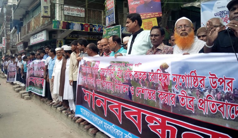 ইমাম হাসান তানিমঃ রোববার উল্লাপাড়া পৌর শহরে মিয়ানমারে রহিঙ্গাদের গণহত্যা, নির্যাতন, ধর্ষণ ও দেশ থেকে বিতাড়ণের প্রতিবাদে চারটি সংগঠন ও প্রতিষ্ঠান স্ব স্ব ব্যানারে সম্মিলিতভাবে মানববন্ধন কর্মসূচি পালন করে। সংগঠনগুলো হলো বাংলাদেশ মানবাধিকার কমিশন উল্লাপাড়া শাখা, বাংলাদেশ উদীচী শিল্পী গোষ্ঠী উল্লাপাড়া শাখা, উল্লাপাড়া বাজার বণিক সমিতি ও উল্লাপাড়া কামিল মাদ্রাসা। থানা মোড় চত্ত্বরে শহীদ মিনার পাদদেশে মানববন্ধন কর্মসূচি চলাকালে উল্লাপাড়ার সাবেক সংসদ সদস্য শফিকুল ইসলাম শফি, উপজেলা পরিষদ চেয়ারম্যান এ্যাড. মারুফ-বিন-হাবিব, পৌর মেয়র এস.এম নজরুল ইসলাম, সরকারি আকবর আলী কলেজের সহকারী অধ্যাপক শামীম হাসান, মানবাধিকার কমিশন উল্লাপাড়া শাখার সভাপতি আব্দুল বাতেন হিরু, বাজার বণিক সমিতির সভাপতি আব্দুল কুদ্দুস, মুক্তিযোদ্ধা গোলাম মোস্তফা, অধ্যাপক ইদ্রিস আলী, এহসানুল হাসান সন্টু, মজিবুর রহমান, রফিকুল ইসলাম, রাজু আহমেদ সাহান প্রমুখ বক্তব্য রাখেন।