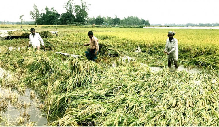 আম্ফানের প্রভাবে সৃষ্ট উজানের ঢলে গত কয়েক দিনে সিরাজগঞ্জের শাহজাদপুর উপজেলার যমুনা নদীতে অস্বাভাবিক হারে পানি বৃদ্ধির ফলে নিম্নাঞ্চলে রোপিত প্রায় ২০ হেক্টর কাঁচা-পাঁকা ধানের ক্ষেত তলিয়ে গেছে। পানি বৃদ্ধির ফলে উপজেলার বাঘাবাড়ি-নিমাইচড়া বন্যা নিয়ন্ত্রণ বাঁধ হুমকির মুখে পড়েছে। এ বাঁধটি ভেঙ্গে গেলে শাহজাদপুর উপজেলার প্রায় ১৪ হাজার হেক্টর ধানের জমিসহ বৃহত্তর চলনবিলের বিভিন্ন উপজেলায় রোপিত বিপুল পরিমান ধান ও অন্যান্য ফসল বন্যার পানিতে ক্ষতিগ্রস্থ হবে। সেইসাথে উপজেলার বিস্তৃর্ণ বাথান এলাকা প্লাবিত হয়ে গো-খাদ্যেরও তীব্র সংকট সৃষ্টি হবে। একদিকে পানি বৃ্িদ্ধ ও অন্যদিকে শ্রমিক সংকটে পড়ে ধান কাটা নিয়ে এলাকার হাজার হাজার কৃষক মহাবিপাকে পতিত হয়ে বর্তমানে প্রতিটি মুহুর্ত চরম উদ্বেগ আর উৎকন্ঠায় কাটাচ্ছেন। উদ্ভূত পরিস্থিতিতে এদিন রোববার দুপুরে সিরাজগঞ্জ জেলা প্রশাসক ড. ফারুক আহমদ বাঘাবাড়ি-নিমাইচড়া বন্যা নিয়ন্ত্রণ বাঁধ পরিদর্শন করে বাঁধের সুরক্ষা নিশ্চিতে সংশ্লিষ্টদের যথাযথ নির্দেশ দিয়েছেন। উপজেলা কৃষি অফিস সূত্রে জানা গেছে, চলতি ইরি-বোরো মৌসুমে শাহজাদপুর উপজেলায় ২২ হাজার ৮’শ ৭০ হেক্টর জমিতে ইরি-বোরো ধানের আবাদ করা হয়। ইতিমধ্যে প্রায় ৮ হাজার হেক্টর জমির ধান কাটা সম্পন্ন হয়েছে। অবশিষ্ট ১৪ হাজার ৮’শ ৭০ হেক্টর জমির পাঁকা, আধা-পাঁকা জামির ধান কাটতে এখনও কমপক্ষে ৭ দিন সময় লাগবে। এর মধ্যে পানিবৃদ্ধি অব্যাহত থাকলে কৃষকদের ধান ঘরে তোলা অসম্ভব হয়ে পড়বে। এদিকে, যমুনায় পানি বৃদ্ধির ফলে ইতিমধ্যেই যমুনার চরাঞ্চলের চামতারা, ছোট চামতারা, বানতিয়ার, বানিয়া সিংগুলীতে রোপিত প্রায় ১’শ হেক্টর জমির ধান, বাদাম, তিল, পটল, কাঁচা মরিচ, করোলাসহ সবজির ক্ষেত প্লাবিত হয়েছে। এতে চরাঞ্চলের কৃষকদের অবর্ণনীয় ক্ষতি হয়েছে। উপজেলার সোনাতুনী ও হাবিবুল্লাহনগর ইউনিয়নের লূৎফর রহমান, আব্দুল মালেক, রমজান মোল্লা, রায়হান মোল্লা ও শুকচাঁদ মীরসহ স্থানীয় কৃষকেরা জানান,‘হঠাৎ করে যমুনায় পানি বৃৃদ্ধি পাওয়ায় তাদের ধানসহ সবজির ক্ষেত ডুবে গেছে। অধিক মজুরী দিয়েও ধান কাটা শ্রমিক না পাওয়ায় তারা নিজেরা পরিবারের সবাইকে নিয়ে ঝুঁকির মধ্যে পাঁকা, আধা-পাঁকা ধান কাটতে বাধ্য হচ্ছেন।’ এদিকে, উপজেলা কৃষি অফিসার মো: আব্দুস সালাম জানান, ‘যমুনায় গত ৩ দিনে ৬ ফুট পানি বৃদ্ধিতে প্রায় ২০ হেক্টর ধানের জমিতে পানি ঢুকেছে। ডুবে যাওয়ার আগেই কৃষকেরা এসব ধান কেটে ফেলছে। ধান কাটার জন্য সরকারি প্রণোদনার ১৬ টি ও বাইরে থেকে আনা আরও ৩০ টিসহ মোট ৫৬টি কম্বাইন্ড হার্ভেষ্টার দিয়ে দ্রুত গতিতে ধান কাটার কাজ চলছে যা সপ্তাহখানিকের মধ্যে শেষ হবে বলে আশা করা হচ্ছে।’ অপরদিকে, 