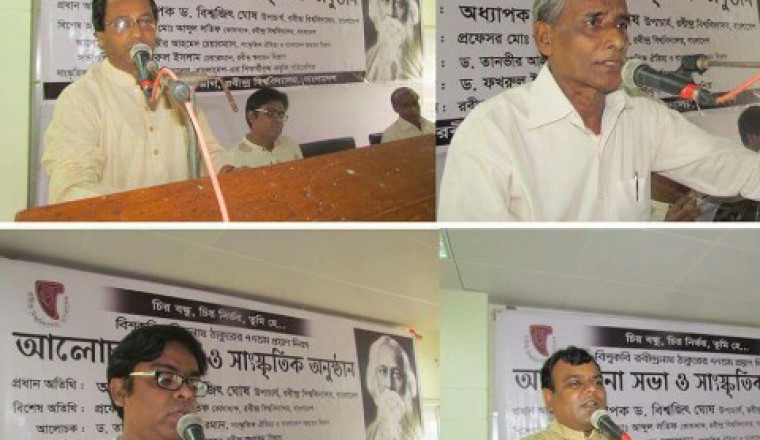 নিজস্ব প্রতিবেদক : বিশ্বকবি রবীন্দ্রনাথ ঠাকুরের ৭৭তম প্রয়াণ দিবস উপলক্ষে  শুক্রবার শাহজাদপুর রবীন্দ্র বিশ্ববিদ্যালয়, বাংলাদেশ এর অস্থায়ী একাডেমিক ভবনে আলোচনা সভা ও সাংস্কৃতিক অনুষ্ঠান অনুষ্ঠিত হয়। উক্ত আলোচনা সভায় প্রধান অতিথি হিসেবে উপস্থিত ছিলেন রবীন্দ্র বিশ্ববিদ্যালয়, বাংলাদেশ এর উপাচার্য অধ্যাপক ড. বিশ্বজিৎ ঘোষ। প্রধান অতিথির বক্তব্যে তিনি বলেন, রবীন্দ্রনাথকে জানতে ও শিখতে হবে। বিশ্বকবি রবীন্দ্রনাথ ঠাকুর শাহজাদপুরে বসবাস করেছেন। তিনি শাহজাদপুরে অনেক কবিতা ও গল্প লিখেছেন। তার গানে বাঙালির প্রেম, সৌন্দর্য ও বেদনার অনেকান্ত রূপ শিল্পিতা পেয়েছে। তিনি শাহজাদপুরে বুড়ি পোতাজিয়া ও রামকান্তপুর মৌজায় প্রায় ১২শ’ একর জমি গো-চারণের জন্য লাখেরাজ দান করেছেন। এ সময় তিনি শিক্ষার্থীদের উদ্দ্যেশে বলেন, সৃষ্টিশীল ও মননশীল হতে হবে শিক্ষার্থীদের। এ জন্য পড়াশোনা করতে হবে। আইনের বাইরে গিয়ে এমন কিছু করবে না যা অন্যের ক্ষতির  কারণ হতে পারে । তিনি আরও বলেন, সমাজে বেঁচে থাকতে হলে ন্যায় নিষ্ঠার বিকল্প নাই। অন্তরের চোখ দিয়ে দেখে বিচার করো বাহিরের চোখ দিয়ে নয়। জাতির স্বার্থে পরিবর্তন হতে হবে। আমাদের দেখে যেনো সবাই শিখতে পারে। ভিসি এ সময় আরও বলেন, ২২ শে শ্রাবণ বিশ্ববিদ্যালয়ে পরীক্ষা থাকায় আমরা কবিগুরুর প্রয়াণ দিবস আগেই করলাম। রবীন্দ্র অধ্যায়ন বিভাগের চেয়ারম্যান ড. ফখরুল ইসলামের সভাপতিত্বে অনুষ্ঠিত ওই সভায় বিশেষ অতিথি হিসেবে বক্তব্য রাখেন ট্রেজারার প্রফেসর মোঃ আব্দুল লতিফ।  ‘রাজা’ নাটকে রাষ্ট্র ধারণা অনুষ্ঠানে মূল আলোচক ছিলেন সাংস্কৃতিক ঐতিহ্য ও বাংলাদেশ অধ্যায়ন বিভাগের চেয়ারম্যান ড. তানভীর আহমেদ। অনুষ্ঠান সঞ্চালনা করেন শিক্ষার্থী মোছাঃ নূর মাহফুজা এবং এ, কে, এম নাজমুল হাসান। অনুষ্ঠান পরিচালনায় ছিলেন সোহাগ হোসেন, অনিক ঘোষ, জারিফ হোসেন, হাসিবুর রহমান, সোয়েব হাসান, আবিদ ও আলমগীর হোসেন প্রমুখ। শেষে বিদ্যালয়ের শিক্ষার্থীরা সাংস্কৃতিক অনুষ্ঠান পরিবেশন করেন।
