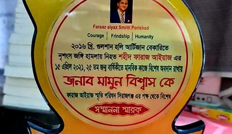 মানবতা ও বন্যপ্রাণী নিয়ে কাজ করায় ফারাজ আইয়াজ স্মৃতি পরিষদ সিরাজগঞ্জ এর পক্ষ থেকে শহীদ ফারাজ আইয়াজ এর ২৫ তম জন্ম বার্ষিকী উপলক্ষে  বিশেষ সম্মাননা স্মারক প্রদান করেন মানবতার ফেরিওয়ালা মামুন বিশ্বাসকে । ফারাজ আইয়াজ স্মৃতি পরিষদ সিরাজগঞ্জ জেলায় একজন মানবসেবায়, একজন শিক্ষক, একজন বৃক্ষপ্রেমিক এবং একজন সাংবাদিক, মোট ৪ জনকে এই সম্মাননা স্মারক দিয়েছেন। এ বিষয়ে মামুন বিশ্বাস তার ফেইসবুক জানান, লক ডাউন শেষ হলে আনুষ্ঠানিক ভাবে সম্মাননা স্মারক তুলে দিবেন ফারাজ আইয়াজ স্মৃতি পরিষদ সিরাজগঞ্জ।