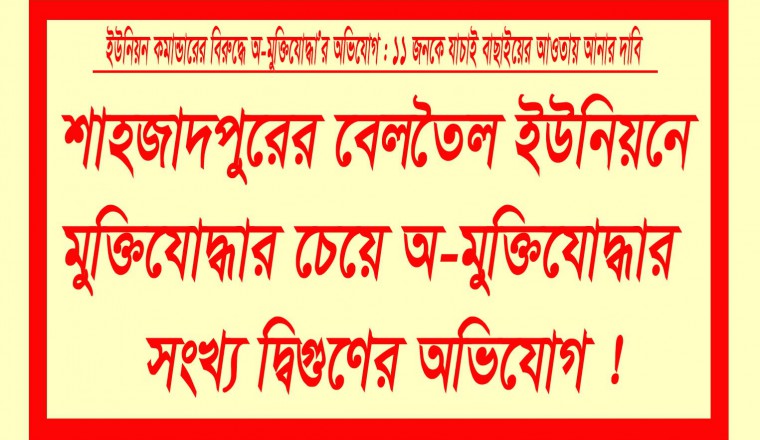 শাহজাদপুর প্রতিনিধি: শাহজাদপুর উপজেলার বেলতৈল ইউনিয়নের প্রকৃত মুক্তিযোদ্ধার চেয়ে অ-মুক্তিযোদ্ধার সংখ্যা দ্বিগুণ বলে বলে জানা গেছে। ওই ইউনিয়নের ১১ জন অ-মুক্তিযোদ্ধার বিরুদ্ধে এমনই অভিযোগ করছে এলাকাবাসী। শুধু তাই নয়, ওই ১১ জন অ-মুক্তিযোদ্ধাদের একজন ইউনিয়ন কমান্ডার আবার এদের একজন উপজেলা কমান্ডের সদস্য বলেও অভিযোগে উল্লেখ করা হয়েছে। এলাকাবাসী অভিযোগে জানায়, শাহজাদপুর উপজেলার শিবরামপুর গ্রামের মৃত জামাত আলী শেখের ছেলে ইউনিয়ন মুক্তিযোদ্ধা সংসদের কমান্ডার বাহাদুর আলী একজন অ-মুক্তিযোদ্ধা। তার গেজেট নং-১৬৪৪, মুক্তিবার্তা নং-০৩১২০৪০২৬৮, সাময়িক সনদ নং- ম-৬৯২৬১ তারিখ০১/০২/০৫ খ্রিষ্টাব্দ। তিনি গত ২০০২-০৩ অর্থ বছর থেকে ভাতা গ্রহন করছেন। শাহজাদপুর উপজেলার বেলতৈল ইউনিয়নের চরবেলতৈল গ্রামের মৃত রহমতুল্লাহ সরকারের ছেলে গাজী মিজানুর রহমানের গেজেট নং-১৭৩৩, প্রকাশের তারিখ : ৪ ডিসেম্বর-২০০৪ খ্রি., মুক্তিবার্তা নং-০৩১২০৪০০২৮, সাময়িক সনদ নং- ১৩২০২, তারিখ-০৯/০২/২০০৩ খ্রি.। তিনি নিজে অ-মুক্তিযোদ্ধা হয়েও মুক্তিযোদ্ধা সংসদ উপজেলা কমান্ডের সদস্য হিসাবে দায়িত্ব পালন করছেন এবং ২০০২-০৩ অর্থ বছর থেকে ভাতা গ্রহন করছেন। অভিযুক্ত অন্যান্য অ-মুক্তিযোদ্ধারা হলেন, উপজেলার শ্রীফলতলা গ্রামের লালচার সরকারের ছেলে মো: আব্দুস সালাম, গেজেট নং-১৬৫৯, মুক্তিবার্তায় নাম নেই, মন্ত্রনালয়ের সাময়িক সনদপত্র নং- ম-১১৩৪৯৬, তিনি ২০১৩-১৪ অর্থবছর থেকে ভাতা গ্রহন করছেন। শিবরামপুর গ্রামের মৃত আফতাবউদ্দিন সরকারের ছেলে মো: আব্দস সাত্তার, গেজেট নং-১৭৯৬, মুক্তিবার্তা নং- ০৩১২০৪০২৬৬৬, মন্ত্রনালয়ের সাময়িক সনদ নং- ১১৫৯৫৫,তারিখ- ০৫/০৪/০৬ খ্রি., তিনি ২০০২-০৩ অর্থবছর থেকে ভাতা গ্রহন করছেন। ঘোষ শ্রীফলতলা গ্রামের আব্দুল জব্বারের ছেলে মনছুর রহমান, গেজেট নং-১৮১১, মুক্তিবার্তায় নাম নেই, মন্ত্রনালয়ের সাময়িক সনদপত্র নং- ম-২৯৮২৫, তারিখ : ০৭/০৭/০৩ খ্রি., তিনি ২০০২-০৩ অর্থবছর থেকে ভাতা গ্রহণ করছেন। শিবরামপুর গ্রামের মোহাম্মদ আলী সরকারের ছেলে আব্দুল করিম (পুলিশ), গেজেট নং-১৮৯৭, মুক্তিবার্তা নং-০৩১২৯৪২৮৬, মন্ত্রনালয়ের সাময়িক সনদপত্র নং- ম-৩৩৭৪৫, তারিখ-২২/১১/২০০০ খ্রি, ২০০২-০৩ অর্থবছর থেকে ভাতা গ্রহন করছেন। শ্রীফলতলা গ্রামের মৃত আবু তালেব সরকারের ছেলে মো: আব্দুর রশীদ, গেজেট নং ২৭৯৫, মুক্তিবার্তায় নাম নাই, সনদ নাই, তিনি-২০১৩-১৪ অর্থবছর থেকে ভাতা গ্রহন করছেন। ঘোষ শ্রীফলতলা গ্রামের আব্দুল মালেকের পুত্র মো: জহুরুল হক, গেজেট-২৮৮৫, মুক্তবার্তায় নাম নেই, মন্ত্রনালয়ের সাময়িক সনদ নং- ম- ১৭১৬৩৪, তিনি ২০১৩-১৪ অর্থ বছর থেকে ভাতা গ্রহন করছেন। শ্রীফলতলা গ্রামের মৃত হায়দার আলী সরকারের ছেলে মো: আফসার আলী, গেজ