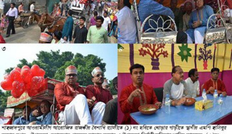 শাহজাদপুর সংবাদদাতা : বাংলা নববর্ষ উপলক্ষে শাহজাদপুর উপজেলা আওয়ামীলীগ এর উদ্যোগে রাজকীয় বৈশাখি আয়োজন করা হয়েছিল। এ উপলক্ষ্যে ১ বৈশাখ সকালে শাহজাদপুরে স্থানীয় এমপি ও সাবেক শিল্প উপমন্ত্রী হাসিবুর রহমান স্বপনের নেতৃত্বে একাধিক ঘোড়ার গাড়ীতে মঙ্গল শোভাযাত্রা শহরের প্রধান প্রধান সড়ক প্রদক্ষীন করে। উক্ত মঙ্গল শোভাযাত্রায়, উপজেলা চেয়ারম্যান প্রফেসর আজাদ রহমান, উপজেলা ভাইস চেয়ারম্যান মোস্তাক আহমেদ, মহিলা ভাইস চেয়ারম্যান, উপজেলা নির্বাহী অফিসার শামিম আহমেদ , শাহজাদপুর থানার অফিসার ইনচার্জ শাহাবুদ্দিন খলিফা, উপজেলা প্রাথমিক শিক্ষা অফিসার আক্তারুজ্জামান, মাধ্যমি শিক্ষা অফিসার শফিকুল ইসলাম, কৈজুরি ইউপি চেয়ারম্যান ও উপজেলা আওয়ামীলীগের যুগ্ন সাধারন সম্পাদক সাইফুল ইসলামসহ দলের নেতাকর্মীবৃন্দ। পরে শাহজাদপুর পাইলট উচ্চ বিদ্যালয় মাঠে তৈরী প্যান্ডেলে পান্তা ইলিশ খেয়ে নববর্ষ পালন করা হয়। উক্ত রাজকীয় পান্তা-ইলিশ অনুষ্টানে কয়েক হাজার লোকের খাবার আয়োজন করা হয়েছিল। পান্তা ইলিশ খাওয়ার পরে শুরু হয় মনোজ্ঞ সাংস্কৃতিক অনুষ্ঠান। সংগীত পরিবেশন করেন, শিল্পি মুন,সুমন বাপ্পি, লিমিস ও ক্লোজআপ ওয়ান তারকা বিউটি । দর্শক গ্যালারীতে বসে অনুষ্ঠান উপভোগ করেন, এমপি হাসিবুর রহমান স্বপন, চেয়ারম্যান আজাদ রহমান, উপজেলা নির্বাহী অফিসার শামিম আহমেদ, ওসি শাহাবুদ্দিন খলিফা, ভাইস চেয়ারম্যান মুস্তাক আহমেদ, উপজেলা আওয়মীলীগ যুগ্ন সম্পাদক ও কৈজুরি ইউপি চেয়ারম্যান সাইফুল ইসলামসহ আওয়ামীলীগ নেতৃবৃন্দ। উক্ত অনুষ্ঠান উপভোগ করতে উপস্থিত ছিল এ প্রজন্মের যুব ও নারী সমাজের একাংশ।