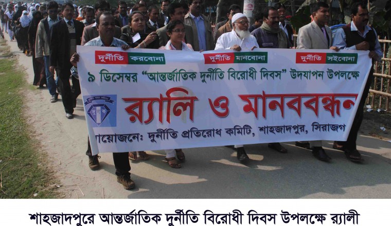 আজ শাহজাদপুরে আন্তর্জাতিক দুর্ণীতি বিরোধী দিবস পালিত হয় । এ উপলক্ষে র্যালি, মানববন্ধন, সমাবেশ ও সাংস্কৃতিক অনুষ্ঠান অনুষ্ঠিত হয়। শাহজাদপুর উপজেলা দূর্ণীতি প্রতিরোধ কমিটি এ অনুষ্ঠানের আয়োজন করে। এতে প্রধান অতিথি হিসেবে উপস্থিত ছিলেন উপজেলা চেয়ারম্যান আজাদ রহমান। বক্তব্য রাখেন উপজেলা নির্বাহী অফিসার শামীম আহমেদ, প্রফেসর নাছিম উদ্দিন মালিথা, প্রফেসর আব্দুল আজিজ, উপজেলা ভাইস চেয়ারম্যান মুস্তাক আহমেদ, মাধ্যমিক শিক্ষা অফিসার শফিকুল ইসলাম, ইন্সপেক্টর (তদন্ত) আব্দুল হাই প্রমুখ। দুর্ণীতি বিরোধী র্যালীটি উপজেলা চত্বর থেকে শুরু হয়ে শহর প্রদক্ষিণ শেষে উপজেলা চত্বরে সমাবেশ ও সাংস্কৃতিক অনুষ্ঠান অনুষ্ঠিত হয়।