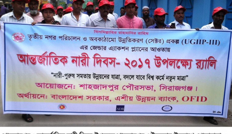 মোঃ মুমীদুজ্জামান জাহানঃ শাহজাদপুরে বিভিন্ন সংগঠন আজ বুধবার আন্তর্জাতিক নারী দিবস উদযাপন উপলক্ষে নানা কর্মসূচী পালন করে। দিন ব্যাপী এ কর্মসূচীর মধ্যে ছিল, বর্ণাঢ্য র‌্যালী, আলোচনা সভা ও পুরষ্কার বিতরণ। শাহজাদপুর পৌরসভা, উপজেলা প্রশাসন ও উপজেলা মহিলা বিষয়ক অধিদপ্তর পৃথক পৃথক ভাবে এ কর্মসূচী পালন করে। পৃথক র‌্যালী গুলো শহরের বিভিন্ন সড়ক ও মোড় প্রদক্ষিণ করে। ভারপ্রাপ্ত পৌর মেয়র নাসির উদ্দিনের সভাপতিত্বে অনুষ্ঠিত আলোচনা সভায় বক্তব্য রাখেন, কাউন্সিলর মামুন মিয়া জামাল উদ্দিন, কোরবান আলী, জান্নাতুল পেরদৌস লাভলী ও সিলভিয়া পারভীন মিঠু। উপজেলা প্রশাসন আয়োজিত আলোচনা সভায় প্রধান অতিথি ছিলেন, উপজেলা চেয়ারম্যান প্রফেসর আজাদ রহমান। উপজেলা নির্বাহী অফিসার আলীমুন রাজীবের সভাপতিত্বে অনুষ্ঠিত আলোচনা সভায় বক্তব্য রাখেন, ভাইস চেয়ারম্যান মুস্তাক আহমেদ, মহিলা বিষয়ক কর্মকর্তা রেখামনি পারভীন ও কনিকা পারভীন। সব শেষে বিভিন্ন ক্ষেত্রে অবদানের জন্য বেশ কয়েক জন নারীকে পুরষ্কার প্রদান করা হয়।