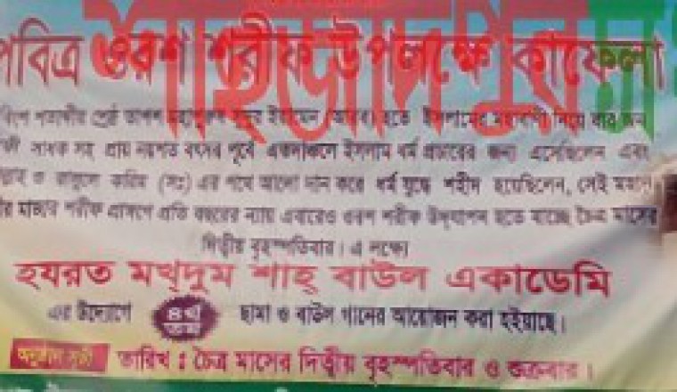 নিজস্ব প্রতিবেদক : শাহজাদপুর উপজেলার দরগাহপাড়াস্থ করতোয়া নদীর তীরে অনুষ্ঠিত হযরত মখদুম শাহদৌলা শহিদ ইয়ামেনি (রহ.) এর ২ দিনব্যাপী বাৎসরিক ওরশ শরীফ আজ (বৃহস্পতিবার) শুরু হয়েছে। এ উপলক্ষে আজ (বৃহস্পতিবার) বাদ মাগরিব করতোয়া নদীর পূর্ব পাড়স্থ দরগার চর এলাকায় শাহজাদপুর দ্বারিয়াপুর কুলি শ্রমিক ইউনিয়নের সহযোগীতায় লালন শাহ্ সংগীত বিদ্যালয় এবং হযরত মখদুম শাহ্ বাউল একাডেমির পক্ষ থেকে হযরত খাজা মইনুদ্দিন চিশতি আজমিরি (রহ.) ও হযরত মখদুম শাহদৌলা শহিদ ইয়ামেনি (রহ) এর শানে ভাবসংগীত অনুষ্ঠিত হবে। উক্ত ভাবসংগীত শ্রবণের জন্য সর্বসাধারণের প্রতি উদাত্ব আহবান জানিয়েছেন শাহজাদপুর দ্বারিয়াপুর কুলি শ্রমিক ইউনিয়নের উপদেষ্টা ও সভাপতি মজনু শেখ এবং হযরত মখদুম শাহ্ বাউল একাডেমির পরিচালক কাজী মোস্তফা হোসেন তপন।