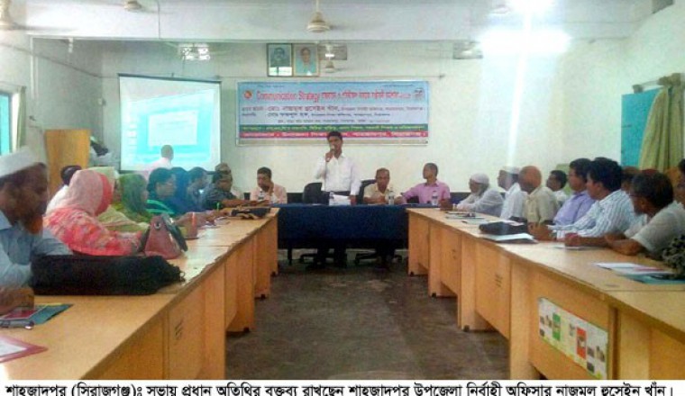 সাগর বসাক, শাহজাদপুর : শাহজাদপুরে কমিউনিকেশন ট্র্যাটেজি বাস্তবায়ন ও পরীবীক্ষণ বিষয়ক সঞ্জীবনী কর্মশালা-২০১৮ অনুষ্ঠিত হয়েছে। আজ বৃহস্পতিবার সকালে উপজেলা পরিষদের শহিদ স্মৃতি মিলনায়তনে অনুষ্ঠিত দিনব্যাপি ওই কর্মশালায় প্রধান অতিথি হিসেবে উপস্থিত ছিলেন শাহজাদপুর উপজেলা নির্বাহী অফিসার নাজমুল হুসেইন খাঁন। শাহজাদপুর উপজেলা শিক্ষা অফিস ওই কর্মশালার আয়োজন করে। দিনব্যাপী অনুষ্ঠিত কর্মশালায় সভাপতিত্ব করেন শাহজাদপুর উপজেলা শিক্ষা অফিসার ফজলুল হক। কর্মশালায় প্রশিক্ষক হিসেবে বক্তব্য রাখেন সিরাজগঞ্জের সহকারী জেলা প্রাথমিক শিক্ষা অফিসার রেজোয়ান হোসেন ও আল ইমরান খন্দকার। কর্মশালায় অন্যান্যের মধ্যে বক্তব্য রাখেন, শাহজাদপুর প্রেসক্লাবের সভাপতি বিমল কুন্ডু, সহকারী শিক্ষা অফিসার রফিকুল ইসলাম, প্রধান শিক্ষক ময়নুল হোসেন সরকার, প্রধান শিক্ষক আলাউদ্দিন, প্রধান শিক্ষক আব্দুর ছবুর, রূপনাই সরকারি প্রাথমিক বিদ্যালয়ের ম্যানেজিং কমিটির সভাপতি আলহাজ্ব শাহজাহান আলী, সহকারী শিক্ষক উজ্জল হোসেন প্রমুখ। দিনব্যাপী অনুষ্ঠিত ওই কর্মশালায় শিক্ষা অফিসের সকল কর্মকর্তা, বিভিন্ন সরকারি প্রাথমিক বিদ্যালয়ের এসএমসির সভাপতি, প্রধান শিক্ষকগণ, সহকারী শিক্ষক, গণমাধ্যমকর্মী, অভিভাবকবৃন্দসহ সুধীবৃন্দ উপস্থিত ছিলেন।