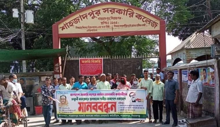শাহজাদপুর সরকারি কলেজে কর্মরত বেসরকারি কর্মচারীদের চাকুরী রাজস্বখাতে স্থানান্তরের দাবীতে মানববন্ধন অনুষ্ঠিত হয়েছে। কেন্দ্রীয় কর্মসূচির অংশ হিসেবে শনিবার সকালে শাহজাদপুর সরকারি কলেজ গেটের সামনে এ মানববন্ধন কর্মসূচি অনুষ্ঠিত হয়। উক্ত মানববন্ধনে শাহজাদপুর সরকারি কলেজের কর্মচারী ইউনিয়নের সভাপতি মোহাম্মদ লুৎফর রহমান বলেন, সরকারি কলেজের কর্মচারীরা ২০ থেকে ২৫ বছর ধরে নাম মাত্র মজুরিতে কাজ করে আসছেন। নির্দিষ্ট বেতন স্কেল না থাকায় পরিবার পরিজন নিয়ে এসব কর্মচারীদের মানবেতর জীবন যাপন করতে হচ্ছে। তাদের পদগুলোকে সরকারের রাজস্ব খাতের অন্তর্ভুক্ত করে সরকারি কর্মচারী হিসেবে বেতন স্কেলের আওতায় আনতে জোর দাবি জানান তিনি। কর্মচারী ইউনিয়নের সাধারণ সম্পাদক শাহনাজ পারভীন বলেন, নির্দিষ্ট বেতন স্কেল না থাকায় বর্তমানে আমরা পরিবার পরিজন নিয়ে খুবই মানবেতর জীবন যাপন করছি। দ্রব্যমূল্য ঊর্ধ্বগতির কারণে আমাদের সন্তানদের লেখাপড়া বন্ধ হয়ে যাচ্ছে। শাহজাদপুর সরকারি কলেজে বিভিন্ন পদে বেসরকারিভাবে নিয়োগ পাওয়া ২৪ জন কর্মচারী নামমাত্র মজুরি নিয়ে কাজ করে আসছেন। সরকারি কর্মচারী হিসেবে বেতন স্কেলের আওতায় আনার জন্য প্রধানমন্ত্রীর হস্তক্ষেপ কামনা করেন । মাননীয় প্রধানমন্ত্রীর সুদৃষ্টি কামনা করে মানববন্ধনে অন্যান্য বক্তারা বলেন, আমাদের যোগদানের তারিখ হতে চাকুরী রাজস্বখাতে স্থানান্তর করতে হবে, স্বপদে বহাল রেখে সকল প্রকার সরকারি সুবিধা প্রদান করতে হবে, বয়সের কোন উর্দ্ধসীমা থাকবে না। উক্ত মানববন্ধনে উপস্থিত ছিলেন মোঃ আব্দুর রহমান, মোঃ আশিকুরজ্জামান, ফিরোজা বেগম, নান্নু মিয়া, শামছুল হক, আনোয়ার হোসেন, জসিম, স্বপন আলী, আব্দুল রকিব, নিল কমল ঘোষ, মোবারক আলী প্রমুখ।
