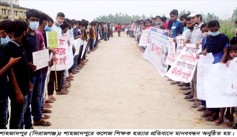 শাহজাদপুর উপজেলার ঠুটিয়া কলেজের সহকারী অধ্যাপক মহররম হোসেনকে (৫২) হত্যার প্রতিবাদে তদন্ত ও সুষ্ঠু বিচারের দাবীতে মানববন্ধন ও সমাবেশ অনুষ্ঠিত হয়েছে। রোববার দুপুরে ওই কলেজ ও হাই স্কুলের শিক্ষক, কর্মচারী ছাত্র-ছাত্রী এই মানববন্ধন ও সমাবেশে অংশ নেন। সাবেক অধ্যক্ষ গাজী মোয়াজ্জেম হোসেনের সভাপতিত্বে অনুষ্ঠিত প্রতিবাদ সমাবেশে বক্তব্য রাখেন, অধ্যক্ষ কামাল পাশা, সহকারী অধ্যাপক নজরুল ইসলাম, প্রভাষক মাসুদুর রহমান, প্রধান শিক্ষক মীর আইয়ুব আলী, সিনিয়র শিক্ষক আজগর আলী, প্রাক্তন ছাত্র আব্দুল্লাহ আল মামুন, আকাশ মিয়া, মাসুদ হোসেন, রবিউল ইসলাম প্রমূখ। বক্তারা বলেন, শিক্ষক মহররম হোসেন আত্মহত্যা করেনি। সম্পত্তির লোভে তাকে বিশেষ কৌশলে হত্যার পর গাছের সাথে লাশ ঝুলিয়ে রেখে আত্মহত্যা বলে প্রচার করা হয়েছে। এ ঘটনাকে ধাপাচাপা দিতে তড়িঘড়ি করে তার লাশ দাফন করা হয়েছে। এ হত্যাকান্ডে সঠিক তদন্ত ও বিচার দাবী করছি। উল্লেখ্য, গত বৃহস্পতিবার সকালে পুলিশ নাটোরের বাগাতিপাড়া উপজেলার ডুমরাই সরকারপাড়া গ্রামের নিজ বাড়ির পাশের একটি গাছের সাথে রশিতে বাধা ও মাটিতে বসে থাকা অবস্থায় ওই শিক্ষকের লাশ উদ্ধার করা হয়।