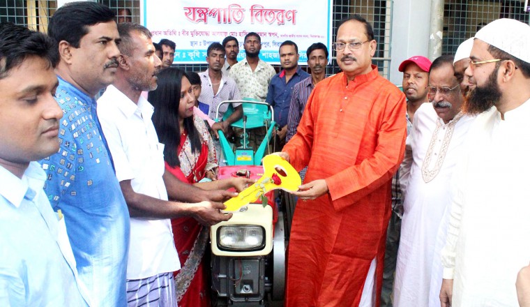 শাহজাদপুর প্রতিনিধি : খামার যান্ত্রিকীকরণের মাধ্যমে ফসল উৎপাদন বৃদ্ধি প্রকল্প ( ২য় পর্যায়) এর আওতায় ৫০ % উন্নয়ন সহায়তায় আজ বুধবার সকালে উপজেলা কৃষি অফিসের উদ্যোগে সিরাজগঞ্জের শাহজাদপুরে কৃষকদের মধ্যে চাষের যন্ত্রপাতি বিতরন করা হয়েছে। এদিন সকালে শাহাজাদপুর উপজেলা পরিষদ চত্বরে এ উপলক্ষে অনুষ্ঠান অনুষ্ঠিত হয়েছে। স্থানীয় এমপি আলহাজ্ব হাসিবুর রহমান স্বপন প্রধান অতিথি হিসেবে উপস্থিত থেকে স্থানীয় কৃষকদের মধ্যে চাষের যন্ত্রপাতি হিসেবে ১টি কম্বাইন হারর্ভেষ্টার, ৫টি সিডার এবং ৩টি পাওয়ার থ্রেসার বিতরন করেন। এ সময় অন্যান্যের মধ্যে শাহজাদপুর উপজেলা পরিষদ চেয়ারম্যান আজাদ রহমান, ভাইস চেয়ারম্যান মুস্তাক আহমেদ, শাহজাদপুর উপজেলা নির্বাহী অফিসার শেহেলী লায়লা, কৃষি কর্মকর্তা মনজু আলম সরকার, ছাত্রলীগ সেক্রেটারি ইসলাম শেখসহ গণ্যমান্য ব্যাক্তিবর্গ উপস্থিত ছিলেন।