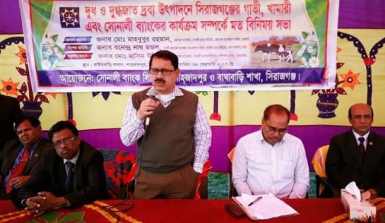 ফারুক হাসান কাহার : এখন থেকে সর্বনিম্ন সুদে, সহজ শর্তে ও ভোগান্তি ছাড়াই গো খামারিদের ঋণ দেওয়া হবে।গতকাল মঙ্গলবার সকালে শাহজাদপুর উপজেলার পোতাজিয়া ইউনিয়নে রাউত বাড়ী বাথানে দুগ্ধ খামারীদের সঙ্গে এক মত বিনিময় অনুষ্ঠানে প্রধান অতিথি হিসাবে সোনালী ব্যাংকের রাজশাহী বিভাগের জেনারেল ম্যানেজার মো. মাহবুবুর রহমান এ কথা বলেন। সোনালী ব্যাংক লিমিটেড শাহজাদপুর শাখা ও বাঘাবাড়ী ঘাট শাখার যৌথ উদ্যোগে এ মতবিনিময় সভা অনুষ্ঠিত হয়। সোনালী ব্যাংক লিমিটেড সিরাজগঞ্জ প্রিন্সিপাল অফিসে ডেপুটি জেনারেল ম্যানেজার হাসিম উদ্দিনের সভাপতিত্বে প্রধান অতিথি ছাড়াও আরো বক্তব্য রাখেন, মিল্ক ভিটার পরিচালক ও বিশিষ্ট খামারী আব্দুস ছামাদ, সিরাজগঞ্জ জেলার প্রাণি সম্পদ কর্মকর্তা আখতারুজ্জামান ভুইয়া, খামারী নুর হোসেন ফকির প্রমুখ।