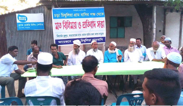 শাহজাদপুর সংবাদ ডটকম, নিজস্ব প্রতিবেদক,  রোববার, ৭ অক্টোবর-২০১৮ খ্রিষ্টাব্দ : আজ  (রোববার) বিকেলে শাহজাদপুর উপজেলার পোতাজিয়া ইউনিয়নের চড়াচিথুলিয়া গ্রামবাসীর উদ্যোগে নির্যাতন, জুলুম ও অত্যাচারের হাত থেকে পরিত্রাণে এক মতবিনিময় ও প্রতিবাদ সভা অনুষ্ঠিত হয়েছে। চড়াচিথুলিয়া চরপাড়া নতুন বাজার সংলগ্ন এলাকায় গ্রামের আব্দুস সালাম শেখের সভাপতিত্বে অনুষ্ঠিত ওই মতবিনিময় ও প্রতিবাদ সভায় অন্যান্যের মধ্যে বক্তব্য রাখেন, মোজাম্মেল মন্ডল, আলহাজ্ব আজাহার প্রামানিক, ইয়াকুব আলী, সেলিম মন্ডল, আব্দুল আলীম, আবু সাঈদ প্রামানিক, রওশন মেম্বর প্রমূখ। বক্তব্যে বক্তারা বলেন, ‘চড়াচিথুলিয়া গ্রামবাসী তাদের গ্রামের জনৈক শফিকুর রহমান শফি কর্তৃক দীর্ঘদিন ধরে নানাভাবে হয়রানী, জুলুমের শিকার, অত্যাচারিত, নির্যাতিত হয়ে আসছেন। তার বিরুদ্ধে প্রতিবাদ করলে প্রতিবাদকারীদের ওপর নেমে আসে নির্যাতনের খড়গ। গ্রামবাসী এ অবস্থা থেকে পরিত্রাণ চায়। এজন্য গ্রামের সিংগভাগ মানুষ গ্রামের জনৈক এক ব্যাক্তি কর্তৃক গ্রামের নিরীহ মানুষের ওপর করা জুলুম অত্যাচারের তীব্র নিন্দা ও প্রতিবাদ জানান। সেইসাথে ভবিষ্যতে গ্রামের কোন নিরীহ মানুষ একই ব্যাক্তি দ্বারা নতুন করে জুলুম অত্যাচার, নির্যাতনের শিকার বা ক্ষতিগ্রস্থ যাতে না হয়, সেজন্য এ মতবিনিময় সভার মাধ্যমে গ্রামের সিংহভাগ মানুষ একমত পোষণ করে ঐক্যবদ্ধ হলো। ভবিষ্যতে একই ব্যাক্তি নতুন করে যদি গ্রামের কোন নিরীহ মানুষকে হয়রানীর চেষ্টা করে সেটি গ্রামবাসী সম্মিলিতভাবে প্রতিহত করবে।’ উক্ত মতবিনিময় ও প্রতিবাদ সভায় চড়াচিথুলিয়া গ্রামের বিভিন্ন শ্রেণিপেশার শত শত মানুষ উপস্থিত ছিলেন।