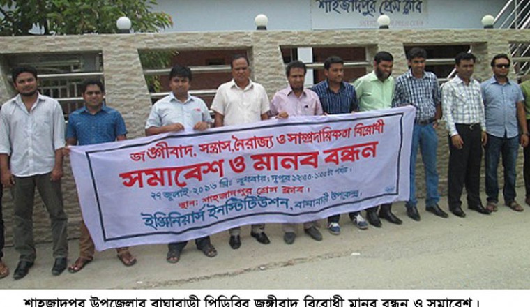 নিজস্ব প্রতিনিধিঃ আজ বুধবার দুপুরে শাহজাদপুরে জঙ্গীবাদ, নৈরাজ্য, সন্ত্রাস ও সাম্প্রদায়ীকতা বিরোধী এক মানব বন্ধন, সমাবেশ ও র্যালী অনুষ্ঠিত হয়। শাহজাদপুর প্রেস ক্লাবের সামনে অনুষ্ঠিত মানব বন্ধন পরবর্তী সমাবেশে বক্তব্য রাখেন বাঘাবাড়ী পিডিবির বিদ্যুৎ উৎপাদন কেন্দ্রর নির্বাহী প্রকৌশলী হাসান জামান, এমদাদুল হক, তাজেদুর রহমান, আজিজুর রহমান, ও এক্সিকিউটিভ ইঞ্জিনিয়ার সোহেল রানা । এছাড়াও পিডিবির বেড়া ও বাঘাবাড়ী উপকেন্দ্রের বিভিন্ন কর্মকর্তা কর্মচারিবৃন্দ এ মানব বন্ধন ও সমাবেশে উপস্থিত ছিলেন। এসময় বক্তারা জঙ্গীবাদের বিরুদ্ধে তীব্র নিন্দা ও প্রতিবাদ জানিয়ে বক্তব্য রাখেন। এছাড়া সরকারের জঙ্গীবাদ নির্মূলের উদ্যোগের ভূয়সী প্রশংসা করেন। এছাড়া শাহজাদপুর সরকরি কলেজের শিক্ষক-কর্মচারী ও শিক্ষার্থীরা জঙ্গীবাদ বিরোধী র্যালী মানব বন্ধন ও সমাবেশ করেছে।