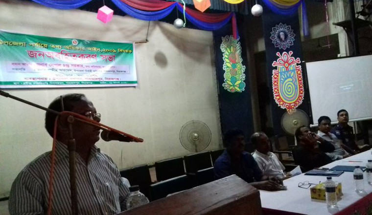 নিজস্ব প্রতিনিধিঃ আজ রোববার সকালে শাহজাদপুর উপজেলার রবীন্দ্র আডিটরিয়ামে তথ্য অধিকার আইন বিষয়ক এক জনঅবহিতকরণ সভা অনুষ্ঠিত হয়। এতে প্রধান অতিথি ছিলেন, তথ্য কমিশনের কমিশনার নেপাল চন্দ্র সরকার। শাহজাদপুর উপজেলা নির্বাহী অফিসার শামীম আহমেদের সভাপতিত্বে অনুষ্ঠিত এ সভায় বক্তব্য রাখেন, তথ্য কমিশনের সহকারী পরিচালক সালাউদ্দিন, উপজেলা চেয়ারম্যান প্রফেসরআজাদ রহমান, ভাইস চেয়ারম্যান মুস্তাক আহমেদ, অতিরিক্ত জেলা প্রশাসক (রাজস্ব) প্রতাপ চন্দ্র বিশ্বাস, সহকারী কমিশনার (ভূমি) আরিফুজ্জামান, ইন্সপেক্টর (তদন্ত) মনিরুল ইসলাম প্রমূখ। তথ্য অধিকার আইন-২০০৯ বিষয়ক এ জনঅবহিতকরণ সভায় কিভাবে সাধারণ নাগরিকগণ এ আইনের মাধ্যমে তাদেরঅধিকার আদায় করবেন সে সম্পর্কে বিস্তারিত ধারনা দেওয়া হয়।