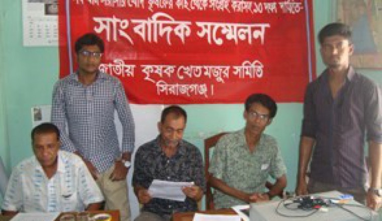 শাহজাদপুর প্রতিনিধিঃ চলতি মৌসুমে ধানের ন্যায্য মূল্য প্রদানসহ ১০ দফা দাবিতে আজ শাহজাদপুরে জাতীয় কৃষক খেতমজুর সমিতির সিরাজগঞ্জ জেলা শাখার পক্ষ থেকে সংবাদ সম্মেলন করা হয়েছে। এ ১০ দফার অন্যান্য দাবি গুলো হল, ধান সহ সকল ফসলের ন্যায্য মূল্য নিশ্চিত করা, বিক্রয় যোগ্য সব ধান সরাসরি কৃষকের কাছ থেকে সংগ্রহ করা, পর্যাপ্ত খাদ্য গুদাম ও উন্নত হিমাগার গড়ে তোলা, বিনামূল্যে সেচ ও সুদ মুক্ত কৃষি ঋণ চালু করা। এ সংবাদ সম্মেলনে লিখিত বক্তব্য পাঠ করেন, জাতীয় কৃষক খেতমজুর সমিতি সিরাজগঞ্জ জেলা শাখার সাধারণ সম্পাদক সঞ্জয় রায়। কেন্দ্রীয় কর্মসূচির অংশ হিসেবে এ সংবাদ সম্মেলনের আয়োজন করা হয়। সংবাদ সম্মেলনে লিখিত বক্তব্যে সঞ্জয় রায় বলেন, বাংলাদেশের জাতীয় অর্থনীতিতে প্রধান ভূমিকা পালন করে এদেশের কৃষক। অথচ কৃষি ও কৃষক আজ হাজারো সমস্যায় জর্জরিত। দীর্ঘদিন ধরে সবচেয়ে অবহেলিত থাকা কৃষকের স্বার্থে আজ পর্যন্ত কৃষিনীতি ও ভূমিনীতি প্রনয়ণ করা হয়নি। প্রকৃত কৃষকের হাতে জমি নেই, অধিকাংশ জমির মালিক অকৃষক। বিগত কয়েক বছরে গরীব কৃষকরা উৎপাদনের খরচ ও ফসলের ন্যায্য মূল্য না পাওয়ায় ক্রমাগত লোকসান গুনছেন। তিনি বলেন, চলতি বছর অঞ্চল ভেদে কৃষকদের বোরো ধান উৎপাদনে মণ প্রতি খরচ হয়েছে সাড়ে ৭শ’ থেকে ৮শ’ টাকা। অথচ বাজারে মণ প্রতি ধানের দাম ৬শ’ থেকে সাড়ে ৬শ’ টাকা। সরকারিভাবে প্রতি মণ ধানের দাম ৮শ’ ৮০ টাকা নির্ধারণ করা হলেও প্রকৃত কৃষক সরাসরি সরকারি খাদ্য গুদামে ধান দিতে পারছে না। লিখিত বক্তব্যে অভিযোগ করা হয় ক্ষমতাসীন দলের ছত্রছায়ায় এক শ্রেণির মধ্যসত্ত্ব ফরিয়া বাজার নিয়ন্ত্রণ করে এর সুফল ভোগ করছে। ন্যায্য মূলে ধান বিক্রয় করতে না পারলে কৃষকের কষ্টার্জিত উৎপাদিত ধানের উৎসব বেদনার অশ্রুতে ভেসে যাবে। তাই কৃষকের প্রধান প্রধান সমস্যাগুলো নিরসনের লক্ষে ধান সহ সকল ফসলের ন্যায্য মূল্য নিশ্চিত করা, সরকারি রেটে সরাসরি খোত কৃষকের কাছ থেকে ধান সংগ্রহ করা সহ ১০ দফা দাবি পূরণের আহবান জানানো হয় সংবাদ সম্মেলনে। এ সময় সংগঠনের কেন্দ্রীয় কমিটির সদস্য আসাদ আলী, কাজী শওকত, বিপ্লবী ছাত্রমৈত্রীর কেন্দ্রীয় নেতা রাজীব আহমেদ ও সিরাজগঞ্জ জেলা ছাত্র নেতা সাজু আহমেদ উপস্থিত ছিলেন।