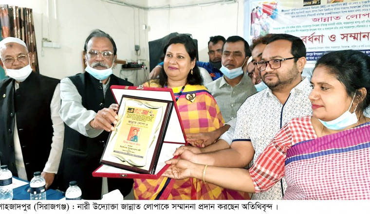 ঐহিত্যবাহী তাঁতশিল্পের কেন্দ্র সিরাজগঞ্জ ও বিন্দু শাহজাদপুরে উৎপাদিত তাঁতবস্ত্র অনলাইনের মাধ্যমে বাংলাদেশসহ বিশ্ববাজারে প্রসারে বিশেষ অবদান রাখায় নারী উদ্যোক্তা সোনার তরী’র স্বত্বাধিকারী জান্নাত লোপাকে সিরাজগঞ্জ জেলা তাঁত মালিক সমিতিসহ ৬ তাঁতী সংগঠনের পক্ষ থেকে সংবর্ধনা ও সম্মাননা প্রদান করা হয়েছে। গতকাল বৃহস্পতিবার সকালে শাহজাদপুর উপজেলা পরিষদের শহিদ স্মৃতি সম্মেলন কক্ষে লোপাকে এ সম্মাননা ও সংবর্ধনা দেয়া হয়। জানা গেছে, তাঁতবস্ত্র উৎপাদন ও বিপননকারী প্রতিষ্ঠান ‘সোনার তরী’র স্বত্বাধিকারী ও নারী উদ্যোক্তা জান্নাত লোপা তার নিজের ডিজাইন ও প্রস্তুতকৃত গামছা, থ্রি-পিছ, শাড়িসহ সিরাজগঞ্জের ঐতিহ্যবাহী তাঁতশিল্পকে পুনরুজ্জীবিতকরণে তাঁতে তৈরি শাড়ি, লুঙ্গি ও গামছার দেশে ও বিদেশে বাণিজ্যিকভাবে বাজার সৃষ্টিতে দীর্ঘদিন করে কাজ করে যাচ্ছেন । women and e-commerce forum (WE) এর সহযোগীতায় জান্নাত লোপা নিজস্ব ডিজাইনের তাঁতের থ্রি-পিছ, গামছা, শাড়িসহ শাহজাদপুর ও সিরাজগঞ্জের তাঁতপল্লীতে উৎপাদিত তাঁতবস্ত্র সরবরাহ ও রফতানি করছেন। সেইসাথে তিনি ঐতিহ্যবাহী তাঁতশিল্প নিয়ে কাজ করা নারী উদ্যোক্তাদের অনুপ্রেরণা যোগাচ্ছেন এবং করোনাকালীন সময়ে সংকটে পতিত তাঁতশিল্পের প্রসার ও পুনরুজ্জীবিত করতে বিশেষ ভুমিকা পালন করে যাচ্ছেন। এসব অবদানের স্বীকৃতি স্বরূপ নারী উদ্যোক্তা জান্নাত লোপাকে সিরাজগঞ্জ জেলা তাঁত মালিক সমিতি, উপজেলা তাঁতবস্ত্র ব্যবসায় সমিতি, শাহজাদপুর কাপড় হাট কাপড় ব্যবসায়ী সমিতি, তাঁত শ্রমিক ইউনিয়ন, উপজেলা তাঁতী লীগ ও তাঁত বোর্ডের ৫ ও ৬ নং ওয়ার্ড মাধ্যমিক তাঁতী সমিতির নেতৃবৃন্দ সংবর্ধনা ও বিশেষ সম্মাননা প্রদান করেন। এদিন সকালে শাহজাদপুরে উপজেলা শহিদ স্মৃতি সম্মেলন কক্ষে জেলা তাঁত মালিক সমিতির সভাপতি ও বাংলাদেশ স্পেশালাইজড টেক্সটাইল মিলস এন্ড পাওয়ারলুম এসোসিয়েশনের পরিচালক বীরমুক্তিযোদ্ধা আলহাজ্ব হায়দার আলীর সভাপতিত্বে ও সাংবাদিক কোরবান আলী লাভলুর সঞ্চালনায় অনুষ্ঠিত এ সংবর্ধনা সভায় প্রধান অতিথি হিসেবে বক্তব্য রাখেন উপজেলা পরিষদ চেয়ারম্যান প্রফেসর আজাদ রহমান। এতে বিশেষ অতিথি হিসেবে বক্তব্য রাখেন, ভাইস চেয়ারম্যান লিয়াকত আলী, ওসি শাহিদ মাহমুদ খান, শাহজাদপুর প্রেস ক্লাবের সভাপতি বিমল কুন্ডু, প্রেস ক্লাব, শাহজাদপুরের সাধারন সম্পাদক ওমর ফারুক, প্রধান শিক্ষক কামরুন্নাহার লাকি, তাঁতী ও শ্রমিক সংগঠনের নেতা আল মাহমুদ, আলমাছ আনছারী, টিপু সুলতান, আবু শামীম সূর্য্য, হায়দার আলী, খসরুজ্জামান খসরু প্রমুখ। বক্তারা বলেন, ‘জান্নাত লোপা দেশে বিদেশে তাঁতবস্ত্রের বাজার সৃষ্টিতে যে ভূমিকা পালন করছেন যা ঐতিহ্যবাহী তাঁতশিল্পের চরম সংকটময