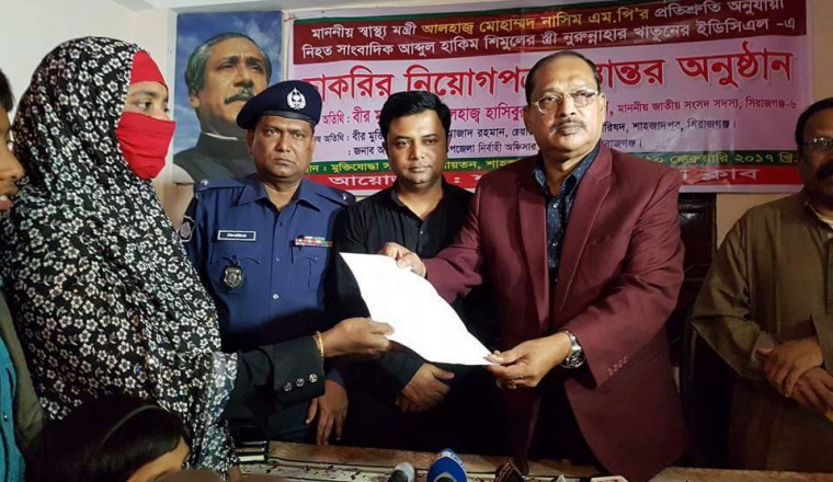 ফারুক হাসান কাহারঃ নিহত শিমুলের স্ত্রী নুরুন্নাহারের হাতে এসেনসিয়াল ড্রাগের নিয়োগপত্র তুলে দিলেন, স্থানীয় সংসদ সদস্য হাসিবুর রহমান স্বপন, প্রেসক্লাবের আয়োজনে প্রেসক্লাবের সাধারন সম্পাদক শফিকুজ্জামান শফির সঞ্চালনায় এই অনুষ্ঠানটি অনুষ্ঠষ্ঠিত হয় । উক্ত অনুষ্ঠানে বক্তব্য রাখেন উপজেলা চেয়ারম্যান প্রফেসর আজাদ রহমান, উপজেলা নির্বাহী অফিসার আলিমুন রাজীব, ওসি গোলাম কিবরিয়া, প্রেসক্লাবের সভাপতি বিমল কুন্ডু, সাংবাদিক ফোরামের সাধারন সম্পাদক শফিকুল ইসলাম ফারুক, রিপোটার্স ক্লাবের সভাপতি আতাউর রহমান পিন্টু, চ্যানেল ৭১ এর জেলা প্রতিনিধি মাসুদ পারভেজ প্রমুখ। এসময় বক্তারা শিমুলের স্ত্রীকে নিয়োগপত্র তুলে দেয়ায় স্বাস্থ্য মন্ত্রী মোহাম্মদ নাসিম, ও সাংসদ হাসিবুর রহমান স্বপনকে ধন্যবাদ জানান।