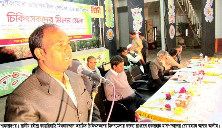 শামছুর রহমান শিশির ও সাগর বসাক : আজ শনিবার শাহজাদপুর রবীন্দ্র কাছারিবাড়ি মিলনায়তনে নূরজাহান হসপিটালের উদ্যোগে চিকিৎসকদের মিলনমেলা অনুষ্ঠিত হয়েছে। বাংলাদেশ গ্রাম ডাক্তার কল্যাণ সমিতির কেন্দ্রীয় কমিটির যুগ্ম-সাধারণ সম্পাদক ডাঃ মুন্সী আব্দুস সালামের সভাপতিত্বে অনুষ্ঠিত চিকিৎসকদের উক্ত মিলন মেলা উপলক্ষে অনুষ্ঠিত আলোচনা সভায় প্রধান অতিথি হিসেবে বক্তব্য রাখেন, নূরজাহান হাসপাতালের চেয়ারম্যান আব্দুল আলীম। বিশেষ অতিথি হিসেবে বক্তব্য রাখেন, গাইনী বিশেষঞ্জ ও সার্জন ডাঃ সানজিদা আক্তার, ডাঃ নাহিদ রেজা রিপন, ডাঃ এ বি এম কামরুন হাসান, সার্জন ডাঃ মোঃ মুস্তাকিম বিল্লাহ জনি, ডাঃ সজিব রায়হান, ডাঃ এমএ আজিজ শেখ, ডাঃ ফরহাদ আলী, ডাঃ আব্দুর রাজ্জাক, ডাঃ আব্দুল মান্নান, ডাঃ শফিউল হাসান লাইফ, ডাঃ খোদা বক্স মন্ট প্রমুখ। বক্তারা বলেন, ‘স্থানীয়ভাবে এলকার গরীব, দুঃখী সাধারণ মানুষকে স্বল্প খরচে উচ্চত চিকিৎসাসেবা প্রদানের প্রত্যয় নিয়ে নূরহাজান হসপিটাল চালু করা হয়েছে। ইতিপূর্বে শাহজাদপুরসহ পার্শ্ববর্তী এলাকার জনসাধারণকে উন্নত চিকিৎসাসেবা নিতে ঢাকা, বগুড়াসহ বিভিন্ন জেলা শহরে যেতে হতো। এতে একদিকে যেমন তাদের অতিরিক্ত চিকিৎসা ব্যায় হতো, অন্যদিকে, নানা ভোগান্তিতেও পরতে হতো রোগী ও রোগীদের আত্মীয় স্বজনদের। কিন্তু, শাহজাদপুরে নূরজাহান হাসপাতাল চালুর পর থেকে এখন আর ওইসব রোগীদের দূর-দূরান্তে যেতে হয় না। এখানেই তারা অল্প খরচে অভিজ্ঞ চিকিৎসকগণের দ্বারা উন্নত চিকিৎসাসেবা পাচ্ছেন।’ চিকিৎসকদের উক্ত মিলনমেয়ায় বিশেষজ্ঞ চিকিৎসকগণ, স্থানীয় সকল পল্লী চিকিৎসকসহ সুধীবৃন্দ উপস্থিত ছিলেন। মিলনমেলা শেষে সেখানে মনোজ্ঞ সাংস্কৃতিক অনুষ্ঠান অনুষ্ঠিত হয়।