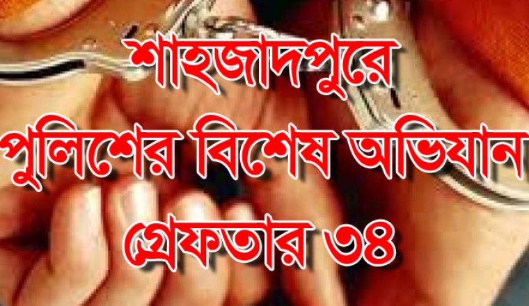 স্থানীয় প্রতিনিধিঃ রাতভর শাহজাদপুর থানার অফিসার ইনচার্জ শাহাবুদ্দিন খলিফার নের্তৃত্বে ওসি (তদন্ত) আব্দুল হাই, এসআই আব্দুস সালাম, এসআই রেজাউল করিম ও সিরাজগঞ্জের অতিরিক্ত পুলিশসহ বিপুল সংখ্যক ফোর্স নিয়ে উপজেলার বিভিন্ন স্থানে অভিযান চালিয়ে বিএনপি জামায়াত নেতা সহ ৩২ জনকে আটক করেছে। এছাড়া সোমবার বিকেলে পুলিশ অভিযান চালিয়ে শাহজাদপুরের মশিপুর গুচ্ছগ্রাম থেকে ২ হেরোইন ব্যাবসায়িকে আটক করে।