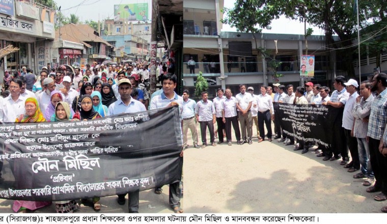 শাহজাদপুর প্রতিনিধি : শাহজাদপুরে ডায়া সরকারি প্রাথমিক বিদ্যালয়ের প্রধান শিক্ষক রশিদুর হাসানকে ঘুষের টাকা না পেয়ে মারপিটের ঘটনায় শাহজাদপুরের শিক্ষক সমাজের মধ্যে চরম উত্তেজনা বিরাজ করছে। এ ঘটনায় শিক্ষকরা মৌন মিছিল ও মানববন্ধন করেছে। জানা গেছে গত বুধবার শাহজাদপুর উপজেলার ডায়া সরকারি প্রাথমিক বিদ্যালয়ের প্রধান শিক্ষক রশিদুল হাসান প্রাথমিক শিক্ষা অফিসে কাজের জন্য গেলে এ সময় শিক্ষা অফিসের অফিস সহকারী আব্দুর রশিদ তাকে ধারালো অস্ত্র দিয়ে কুপিয়ে জখম করে। এ ঘটনার প্রতিবাদে গতকাল বৃহস্পতিবার শাহজাদপুর উপজেলার সরকারি প্রাথমিক শিক্ষক সমিতির উদ্যোগে দুপুরে স্থানীয় প্রেসক্লাব চত্বর থেকে আব্দুর রশিদের দৃষ্টান্তমূলক শাস্তির দাবিতে এক বিশাল মৌন মিছিল শহর প্রদক্ষিণ করে। পরে উপজেলা চত্বরে এক মানববন্ধন কর্মসূচি পালন করে। ইব্রাহীম মডেল সরকারি প্রাথমিক বিদ্যালয়ের প্রধান শিক্ষক মঈনুল ইসলামের সভাপতিত্বে মানববন্ধন কর্মসূচিতে বক্তব্য রাখেন সাধারণ সম্পাদক মনিরুজ্জামান হেনা, প্রধান শিক্ষক আয়শা খন্দকার স্নীগ্ধা, কামরুন্নাহার, কোরবান আলী, আব্দুস সালাম, উজ্জ্বল হোসেন, মমতাজ শিরিন, ফিরোজা বেগম, আহসান হাবীব প্রমূখ। প্রায় ঘন্টাব্যাপী মানববন্ধন চলাকালে বক্তারা বলেন, দূর্নীতিবাজ ঘুষখোর উপজেলা শিক্ষা অফিসের অফিস সহকারী আব্দুর রশিদ তার দৃষ্টান্তমূলক শাস্তি এবং ন্যায্য বিচার না পেলে শিক্ষকেরা কঠোর আন্দোলনে যাবার হুমকি দেন। তারা বলেন, আমরা জাতির বিবেক কিন্তু আমাদের যে মর্যাদাহানি করেছে তার সুবিচার চাই। ঐ ঘুষখোর কর্মকর্তা কোন ফাইল টাকা ছাড়া সই করেন না। এছাড়া ওই অফিসের কর্মকর্তারা এতই দূর্নীতি পরায়ন হয়েছে যা কল্পনা করা যায় না। অফিসটাকে ঘুষের স্বর্গরাজ্য বানিয়েছে। মানববন্ধন শেষে উপজেলা নির্বাহী অফিসার বরাবর একটি স্মারকলিপি পেশ করেন। এ দিকে এ ঘটনায় ওই প্রধান শিক্ষক বাদী হয়ে শাহজাদপুর থানায় একটি মামলা দায়ের করেছেন। একই দিন বিকেলে পুলিশ অফিস সহকারী আব্দুর রশিদকে গ্রেপ্তার করে সিরাজগঞ্জ জেল হাজতে পাঠিয়েছে।