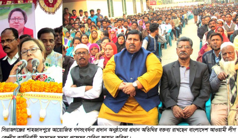 শামছুর রহমান শিশির : আজ মঙ্গলবার বিকেলে শাহজাদপুর পৌর এলাকার শক্তিপুরস্থ প্রয়াত ড. মযহারুল ইসলামের বাসভবনে কেন্দ্রীয় আওয়ামী লীগের কার্যনির্বাহী কমিটির সদস্য ও বদরুন্নেছা কলেজের সাবেক অধ্যক্ষ প্রয়াত ড. মযহারুল ইসলামের মেয়ে প্রফেসর মেরিনা জাহান কবিতাকে গণসংবর্ধনা প্রদান করা হয়েছে। এ গণসংবর্ধনা প্রদান অনুষ্ঠানের প্রধান অতিথি বাংলাদেশ আওয়ামী লীগ কেন্দ্রীয় কার্যনির্বাহী সংসদের সদস্য প্রফেসর মেরিনা জাহান কবিতা তার বক্তব্যে বলেন, ‘বঙ্গবন্ধুর সোনার বাংলা ও মাননীয় প্রধানমন্ত্রী জননেত্রী শেখ হাসিনা’র দিক নির্দেশনায় আমি দেশের মানুষের সেবা করে যেতে চাই। বর্তমান প্রধানমন্ত্রী জননেত্রী শেখ হাসিনা স্বল্প উন্নয়নের দেশ থেকে বাংলাদেশকে মধ্যম আয়ের দেশে পরিণত করেছেন। মাননীয় প্রধানমন্ত্রী জননেত্রী শেখ হাসিনা’র উন্নয়ন আজ সারা বাংলাদেশে উজ্জ্বল দৃষ্টান্ত স্থাপন করেছে। মাননীয় প্রধানমন্ত্রীর নিজ উদ্যোগের স্বপ্নের পদ্মা সেতুও এখন দৃশ্যমান। আমি নেতা হয়ে নয়, কর্মী হয়ে থাকতে চাই। মাননীয় প্রধানমন্ত্রী জননেত্রী শেখ হাসিনা’র কাছ থেকেই রাজনীতি শেখার চেষ্টা করছি। আপনাদের ভালবাসা পেয়ে আমি মুগ্ধ। আমার গর্বিত পিতা ড. মযহারুল ইসলাম ছিলেন নিরহংকার মানুষ। আজ আমার পিতার জন্যই আমরা এতো দূর আসতে পেরেছি। আমাকে বাংলাদেশ আওয়ামী লীগ কেন্দ্রীয় কার্যনির্বাহী কমিটির সদস্য নির্বাচিত করায় মাননীয় প্রধানমন্ত্রীসহ দলীয় সকল পর্যায়ের নেতাকর্মীদের প্রতি গভীর কৃতজ্ঞতা প্রকাশ করছি।’ শাহজাদপুর উপজেলা আওয়ামী লীগের সহ-সভাপতি আব্দুল জব্বারের সভাপতিত্বে ও ফারুক সরকারের সঞ্চালনায় অনুষ্ঠিত ওই গণসংবর্ধনা প্রদান অনুষ্ঠানে অন্যান্যের মধ্যে বক্তব্য রাখেন, বঙ্গবন্ধু পরিষদের সভাপতি ডাঃ ইউনুস আলী খান, সাবেক এমপি চয়ন ইসলাম, জেলা আওয়ামী লীগের সাংগঠনিক সম্পাদক হালিমুল হক মিরু, মিল্কভিটার ভাইস চেয়ারম্যান স্পেশাল পিপি(নারী ও শিশু) জেলা ও উপজেলা আ.লীগ নেতা এ্যাড. শেখ মোঃ আব্দুল হামিদ লাবলু প্রমূখ। এর আগে গাড়াদহ ইউনিয়নের তালগাছী এলাকায় আয়োজিত পথসভায়ও বক্তব্য রাখেন প্রফেসর মেরিনা জাহান কবিতা। গণসংবর্ধনা শেষে সমসাময়িক বিশ্বে একজন অবিসংবাদিত নেতা হিসেবে মাননীয় প্রধানমন্ত্রী শেখ হাসিনা’র অসামান্য অবদান এবং সাফল্যের একটি সুন্দর রূপ রেখা ‘শেখ হাসিনা- বিশ্বের একজন অদ্বিতীয় বিশ্ব নেতা’ নামের একটি বইয়ের মোড়ক উন্মোচন করা হয়। এদিকে, এ গণসংবর্ধনা উপলক্ষে এদিন বিকেল থেকেই সাবেক এমপি চয়ন ইসলামের পৌর এলাকার শক্তিপুর মহল্লার বাসভবনে দলের নেতাকর্মীরা খন্ডখন্ড মিছিল নিয়ে গণসংবর্ধনা অনুষ্ঠানে যোগ দেন। গণসংবর্ধনা প্রদানের পূর্বে তিনি নেত