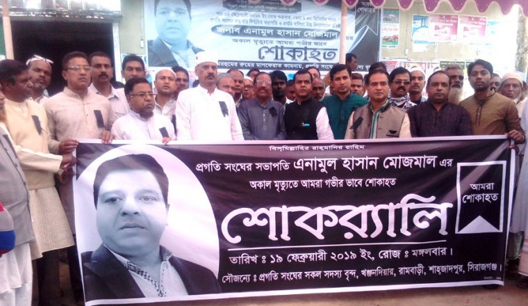 শামছুর রহমান শিশির : আজ মঙ্গলবার শাহজাদপুর পৌর এলাকার খঞ্জনদিয়ারস্থ ঐতিহ্যবাহী অরাজনৈতিক সংগঠন প্রগতি সংঘের উদ্যোগে প্রগতি সংঘের সংগঠনের মরহুম সভাপতি, একতা এন্টারপ্রাইজের স্বত্তাধিকারী, শাহজাদপুর তাঁতবস্ত্র সমিতির সাধারণ সম্পাদক, একতা উন্নয়ন সংস্থার সভাপতি, শাহজাদপুর ইয়ার্ণ মার্চেন্টস এসোসিয়েশনের অন্যতম সদস্য, দেশীয় তাঁতবস্ত্র রফতানীকারক, বিশিষ্ট সমাজসেবক ও তরুণ ব্যবসায়ী নেতা এনামুল হাসান মোজমাল স্মরণে শোকর‌্যালি, আত্মার মাগফেরাত কামনায় দোয়া মাহফিল ও স্মরণসভা অনুষ্ঠিত হয়েছে। এদিন সকালে প্রগতি সংঘ কার্যালয় থেকে বিশাল একটি শোকর‌্যালি বের হয়ে পৌর এলাকার গুরুত্বপূর্ণ সড়ক প্রদক্ষিণ শেষে সেখানেই গিয়ে শেষ হয়। বাদ যোহর প্রগতি সংঘ কার্যালয়ে বিশিষ্ট ব্যবসায়ী আলহাজ্ব সিরাজুল ইসলামের সভাপতিত্বে ও প্রগতি সংঘের সাধারণ সম্পাদক সাজ্জাদ হোসেন আসলামের পরিচালনায় প্রয়াত এনামুল হাসান মোজমাল স্মরণে স্মরণসভা ও মিলাদ মাহফিল অনুষ্ঠিত হয়। এতে মরহুম এনামুল হাসান মোজমালের আত্মার মাগফেরাত কামনায় ও শোকসন্তপ্ত পরিবারের প্রতি গভীর সমবেদনা জানিয়ে মধ্যে বক্তব্য রাখেন, শাহজাদপুর উপজেলা পরিষদ চেয়ারম্যান প্রফেসর আজাদ রহমান, উপজেলা নির্বাহী অফিসার নাজমুল হুসেইন খান, পৌর সভার দায়িত্বপ্রাপ্ত মেয়র নাসির উদ্দিন, সাবেক পৌর মেয়র মোঃ নজরুল ইসলাম, ভাইস চেয়ারম্যান মুস্তাক আহমেদ, অগ্নিবীণা সংসদের সভাপতি ও প্রেসক্লাবের সাধারণ সম্পাদক শফিকুজ্জামান শফি, নির্বাচিত হতে যাওয়া ভাইস চেয়ারম্যান মামুনর রশিদ লিয়াকত, এসআই গোলজার হোসেন, পৌর কাউন্সিলর কোরবান আলী, ইলিয়াস হোসেন ইংরেজ, আ.লীগ নেতা আমিরুল ইসলাম শাহু, আনু লোদী, মোসলেম খা, যুবলীগ নেতা ও সবুজ বিপ্লবের উদ্যোক্তা কামরুল হাসান হিরোক, যুবলীগ নেতা আশিকুল হক দিনার, প্রগতি সংঘের সহ-সভাপতি রওশন আলী রোশনাই, সহ সাধারণ সম্পাদক জামাল হোসেন, ক্রীড়া সম্পাদক আব্দুস সালাম, প্রচার সম্পাদক মজিবর রহমান প্রমূখ। এ সময় গণ্যমান্য ব্যাক্তিবর্গ শুভাকাঙ্খীদের মধ্যে আলহাজ্ব মোঃ সোহরাব হোসেন, আলহাজ্ব মোঃ আব্দুর রউফ, হাফিজুর রহমান দুলাল, সন্টু, মনির হোসেন, লিটন আকন্দ, নাসির হোসেন, মিলন, এনামুল হাসান হিটুসহ শতশত এলাকাবাসী উপস্থিত ছিলেন। স্মরণসভায় বক্তারা মরহুম এনামুল হাসান মোজমালের স্মৃতি চির অম্লান রাখতে প্রগতি সংঘ থেকে পাড়কোলা ও প্রগতি সংঘ হতে মণিরামপুর পর্যন্ত ২টি সড়ক তার নামে নামকরণের দাবী জানালে অবিলম্বে যথাযথ প্রক্রিয়া অনুসরণে তা বাস্তবায়নের আশ্বাস দেন অতিথিবৃন্দ। উল্লেখ্য, গত শুক্রবার (৪০) হৃদযন্ত্র ক্রিয়া বন্ধ হয়ে ঢাকার এ্যাপোলো হাসপাতালে চিকিৎসাধীন অবস্থায় এনামুল হাসান মোজমালের মৃ