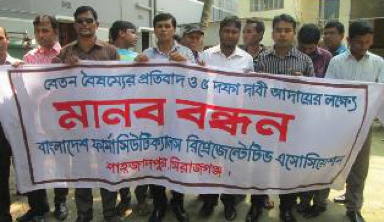 শাহজাদপুর প্রতিনিধি :: সিরাজগঞ্জের শাহজাদপুরে বেতন বৈষম্যর প্রতিবাদ ও ৫ দফা দ্বাবি আদায়ের লক্ষে শাহজাদপুর উপজেলা ফার্মাসউিটিক্যাল রিপ্রেজেন্টেটিভ এসোসিয়েশন মানব বন্ধন করে। জানা গেছে, গতকাল সোমবার সকালে পৌর সদরের ডাকবাংলো রোডে শাহনাজ ভিলার সামনে তারা এ মানব বন্ধন করে। তারা জানায় অবিলম্বে বেতন বৈষম্য দুর করতে হবে এবং আমাদের ৫ দফা দাবি মেনে নিতে হবে। আর তা না হলে আমরা বৃহত্তর আন্দোলনের ডাক দেবো। তাই তারা অবিলম্বে তাদের দাবি মেনে নেয়ার আহবান জানান।