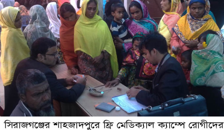 শাহজাদপুর প্রতিনিধিঃ শাহজাদপুরে দিন ব্যাপী ফ্রি-মেডিক্যাল ক্যাম্প অনুষ্ঠিত হয়। আজ শুক্রবার শাহজাদপুর উপজেলার বেলতৈল গ্রামে হাজী ইমদাদ আলী প্রবীণ কল্যাণ কেন্দ্র এ ফ্রি-মেডিক্যাল ক্যাম্পের আয়োজন করে। এতে প্রায় ২ হাজার গরীব দুস্থ্য রোগীকে বিনামূল্যে চক্ষু, দন্ত, গাইনি, শিশু, মেডিসিন, দন্তরোগ ও ডায়াবেটিক রোগের চিকিৎসা প্রদান করা হয়। ফ্রি-ক্যাম্পের উদ্বোধন করেন, হাজী ইমদাদ আলী প্রবীণ কল্যাণ কেন্দ্রের প্রতিষ্ঠাতা আন্তর্জাতিক খ্যাতি সম্পন্ন চক্ষু বিশেষজ্ঞ আলহাজ্ব প্রফেসর ডাঃ হাসান শহীদ। বেলতৈল ইউনিয়ন পরিষদের চেয়ারম্যান ফেরদৌস হোসেন ফুলের সভাপতিত্বে অনুষ্ঠিত উদ্বোধনী অনুষ্ঠানে বক্তব্য রাখেন, এ কল্যাণ কেন্দ্রের সহ-সভাপতি আব্দুস ছোবাহান, ডা. শাহনুর হাসান, ডা: হুমায়ুন কবির, ডা: রিজিয়া পারভীন, ডা: আমিরুল ইসলাম, ডা: আনাম হোসেন, ডা: মোত্তালিব, ডা: সাদিয়া ইমদাদ ও আজিজুর রহমান বিদ্যুৎ প্রমুখ। দিন ব্যাপী এ মেডিক্যাল ক্যাম্পে দুস্থ্য রোগীরা ফ্রি চিকিৎসা পেয়ে অত্যন্ত আনন্দিত হয়ে আযোজকদের দোয়া ও ধন্যবাদ জানান।