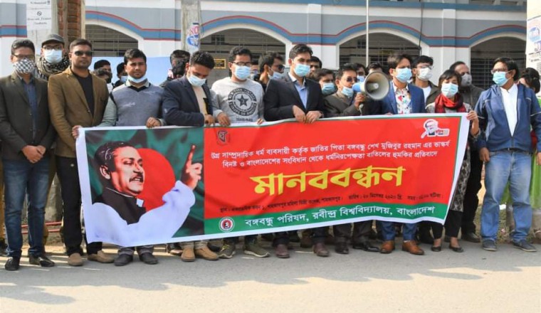 জাতির পিতা বঙ্গবন্ধু শেখ মুজিবুর রহমান ভাস্কর্য বিনষ্ট ও অবমাননার প্রতিবাদে শাহজাদপুরে বঙ্গবন্ধু পরিষদ রবীন্দ্র বিশ্ববিদ্যালয়,বাংলাদেশ শাখার উদ্যোগে মানববন্ধন অনুষ্ঠিত হয়েছে । রোববার দুপুরে শাহজাদপুর পৌরসদরের বিসিক বাসস্ট্যান্ড সংলগ্ন বিশ্ববিদ্যালয়ের অস্থায়ী একাডেমিক ভবন-১ এর সামনে এ মানববন্ধন কর্মসূচি অনুষ্ঠিত হয়। এ মানববন্ধন চলাকালে বক্তব্য রাখেন, বঙ্গবন্ধু পরিষদ রবীন্দ্র বিশ্ববিদ্যালয়, বাংলাদেশ শাখার আহ্বায়ক রেজিস্ট্রার মোঃ সোহরাব আলী, যুগ্ন-আহ্বায়ক মোঃ শিবলী মাহবুব, সদস্য সংগীত বিভাগের চেয়ারম্যান মোঃ রওশন আলম, সদস্য ফারহানা ইয়াসমিন, সদস্য ড. মোহাম্মদ তানভীর আহম্মেদ, সদস্য অর্থনীতি বিভাগের চেয়ারম্যান বরুণ চন্দ্র রায় প্রমূখ । এছাড়াও এ মানববন্ধনে বিশ্ববিদ্যালয়ের শিক্ষক, শিক্ষার্থী, কর্মকর্তা- কর্মচারীবৃন্দ উপস্থিত ছিলেন । বক্তারা বলেন, জাতির পিতা বঙ্গবন্ধু শেখ মুজিবুর রহমান এর ভাস্কর্যের ওপর হামলা মানেই স্বাধীন বাংলাদেশের ওপর হামলা । দেশের প্রত্যেক নাগরিক তাদের স্ব-স্ব জায়গা থেকে সচেতন হলেই স্বাধীনতা বিরোধী অপশক্তির পথ রুদ্ধ করে দেয়া যাবে । অন্যথায় পাকিস্থানী প্রেতাত্মারা সমাজের মধ্যে ওঁৎ পেতে বসে আছে সুযোগের অপেক্ষায়। তারা স্বাধীনতার মূর্ত প্রতীক বঙ্গবন্ধু’কে আঘাত করেছে। পরবর্তীতে স্বাধীনতা নিয়ে প্রশ্ন তুলে দেশকে জঙ্গিবাদী রাষ্ট্র তৈরি করার পরিকল্পনা হাতে নিয়েছে। স্বাধীনতার পক্ষের শক্তিসহ দেশবাসী সজাগ থাকলে ওই অপশক্তির উত্থান রোধ করা যাবে।