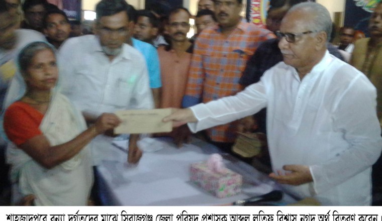 শাহজাদপুরপ্রতিনিধিঃ আজবুধবার দুপুরে শাহজাদপুরের পৌরএলাকাসহ ১৩ টি ইউনিয়নের প্রায় ৯৮০ জনবন্যা দূর্গত অসহায় ব্যাক্তিকে সিরাজগঞ্জ জেলা পরিষদের ত্রাণ তহবিল থেকে জনপ্রতি ৫০০ টাকা হারে নগদ ৪ লাখ ৯০ হাজার টাকা প্রদান করা হয়েছে। শাহজাদপুর রবীন্দ্র কাছারিবাড়ি অডিটরিয়ামে এ ত্রাণ বিতরণ উপলক্ষে আয়োজিত অনুষ্ঠানে প্রধান অতিথি ছিলেন সিরাজগঞ্জ জেলাপরিষদ প্রশাসক, জেলা আওয়ামীলীগের সভাপতি ও সাবেকমৎস্য ও প্রাণীসম্পদ মন্ত্রীআলহাজ আব্দুল লতিফ বিশ্বাস, বিশেষঅতিথি ছিলেনশাহজাদপুর পৌর মেয়র জেলা আওয়ামীলীগের সাংগঠনিক সম্পাদক হালিমূল হক মিরু। বক্তব্য রাখেন, শাহজাদপুর উপজেলা ভাইস চেয়ারম্যান মুস্তাক আহমেদ, কে এম নাসির উদ্দিন, শামছুল ইসলাম, গোলাম মওলা, হাসেম আলী, ফেরদৌস হোসেন ফুল প্রমূখ।