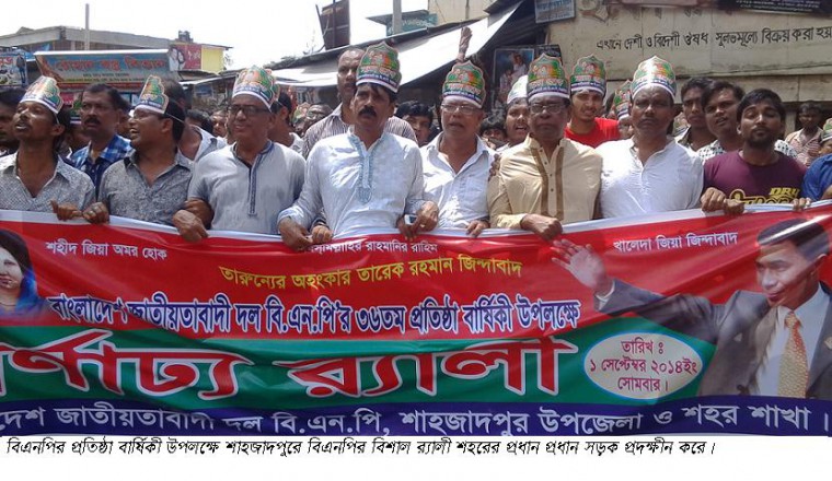 মোঃ শফিকুল ইসলাম ফারুক, শাহজাদপুর সংবাদ ডটকমঃ সোমবার বাংলাদেশ জাতীয়তাবাদী দল বিএনপির ৩৬ তম প্রতিষ্ঠা বার্ষিকী উপলক্ষে শাহজাদপুর উপজেলা বিএনপি, পৌর বিএনপি ও অংগ সংগঠন নানা কর্মসুচি পালন করে। এ উপলক্ষে সকালে জাতীয় ও দলীয় পতাকা উত্তোলন, সকাল সাড়ে দশটায় বর্ণাঢ্য র্যালি শহরের প্রধান প্রধান সড়ক প্রদক্ষীন করে। এছাড়া দলীয় কার্যালয়ে আলোচনা সভা ও মিলাদ মাহফিলের আয়োজন করা হয়। মিলাদ মাহফিলে উপস্থিত ছিলেন, সাবেক সংসদ সদস্য বিএনপির কেন্দ্রীয় নির্বাহী কমিটির সদস্য কামরুদ্দীন এহিয়া খান মজলিস সরোয়ার, শাহজাদপুর উপজেলা বিএনপির সভাপতি হুসেইন শহিদ মাহমুদ গ্যাদন, সাধারন সম্পাদক ইকবাল হোসেন হিরু, সিনিয়র সহ সভাপতি ও পৌর মেয়র নজরুল ইসলাম, যুগ্ন সাধারন সম্পাদক আরিফজ্জামান আরিফ, সাংগঠনিক রেজাউল ইসলাম রাজা, পৌর বিএনপির সাধারন সম্পাদক হাবিবুল হক সাব্বির, যুগ্ন সাধারন সম্পাদক আঃ আজিজ, বিএনপি নেতা রফিকুল ইসলাম শাহিন, উপজেলা যুবদলের সভাপতি ফিরোজ হাসান ফাইট, সাধারন সম্পাদক মিজানুর রহমান মিন্টু, সাংগঠনিক সম্পাদক মোঃ আরিফ, পৌর যুবদলের সভাপতি আব্দুল্লাহ আল মাহমুদ, সাধারন সম্পাদক জাহিদুল ইসলাম, ছাত্রদল নেতা সাবেক জিএস আল-অমিন হোসেন, ছাত্রদল নেতা কামরুজ্জামান বান্টি প্রমুখ।