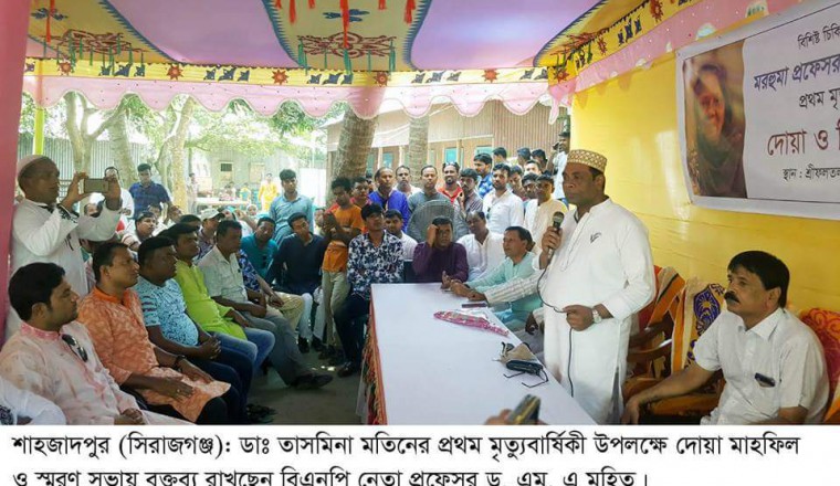 শাহজাদপুর সংবাদ ডটকম, নিজস্ব প্রতিবেদক, বৃহস্পতিবার, ৩০ আগস্ট ২০১৮ খ্রিস্টাব্দ : আজ বৃহস্পতিবার শাহজাদপুর উপজেলার হাবিবুল্লাহ নগর ইউনিয়নের শ্রীফলতলা গ্রামে সাবেক উপ-প্রধানমন্ত্রী প্রফেসর ডাঃ এম এ মতিনের নিজ বাসভবনে বাদ জোহর প্রফেসর ডাঃ এম এ মতিনের সহধর্মিনী বিএনপি নেতা ড. এম এ মুহিতের মাতা ডা. তাসমিনা মতিনের প্রথম মৃত্যুবার্ষিকী উপলক্ষে দোয়া মাহফিল ও স্মরণ সভা অনুষ্ঠিত হয়েছে। স্মরণ সভায় সভাপতিত্ব করেন, উপজেলা বিএনপি’র সিনিয়র সহ-সভাপতি সাবেক মেয়র নজরুল ইসলাম। স্মরণ সভায় উপস্থিত ছিলেন বিএনপি নেতা ড. এম, এ মুহিত, সিরাজগঞ্জ জেলা বিএনপি’র সাধারণ সম্পাদক মো: সাইদুর রহমান বাচ্চু, সিরাজগঞ্জ জেলা বিএনপি'র সহ-সভাপতি নাজমুল হাসান তালুকদার রানা, সিনিয়র যুগ্ম- সাধারণ সম্পাদক ভি পি শামীম খাঁন, সাংগঠনিক সম্পাদক আবু সাইদ সুইট, যুগ্ম- সাধারণ সম্পাদক ভি পি অমর কৃষ্ণ দাস, যুগ্ম- সাধারণ সম্পাদক নূর কায়েম সবুজ, যুগ্ম-সাধারণ সম্পাদক মুন্সী জাহিদ আলম, যুগ্ম-সাধারণ সম্পাদক সাংবাদিক হারুন-অর-রশিদ খান হাসান, জেলা বিএনপি নেতা আলমঙ্গীর আলম, সিরাজগঞ্জ জেলা যুবদলের সভাপতি মীর্জা আব্দুল জব্বার বাবু, সাধারণ সম্পাদক মুরাদুজ্জামান মুরাদ, সিনিয়র সহ-সভাপতি আল-আমিন খান, যুগ্ম-সাধারণ সম্পাদক ময়নাল হোসেন, সিরাজগঞ্জ জেলা সেচ্ছাসেবক দলের সভাপতি আনোয়ার হোসেন রাজেশ, সাংগঠনিক সম্পাদক মিলন হক রন্জু, সিনিয়র সহ- সভাপতি মনিরুল ইসলাম রাষ্ট্র, জেলা ছাত্রদলের সভাপতি জুনায়েদ হোসেন সবুজ, সাধারণ সম্পাদক সেরাজুল ইসলাম সেরাজ, সাংগঠনিক সম্পাদক রিফাত হাসান সুমন, সহ-সভাপতি হাবিবুর রহমান হাবিব শাহজাদপুর পৌর বিএনপি'র সাধারণ সম্পাদক কে এম হাবিবুল হক সাব্বির, উপজেলা বিএনপি'র যুগ্ম-সাধারণ সম্পাদক আরিফুজ্জামান আরিফ, পৌর বিএনপি'র যুগ্ম-সাধারণ সম্পাদক আব্দুল আজিজ, এনায়েতপুর থানা বিএনপি'র সভাপতি লিয়াকত হোসেন, সাধারণ সম্পাদক মন্টু সরকার, বিএনপি নেতা আলমাহমুদ প্রাং, উপজেলা যুবদলের সাধারণ সাধারণ সম্পাদক মিজানুর রহমান মিন্টু, সাংগঠনিক সম্পাদক আরিফ প্রাং, পৌর যুবদল সভাপতি আব্দুল্লাহ আল মাহমুদ সাধারণ সম্পাদক জাহিদুল ইসলাম জাহিদ সাংগঠনিক সম্পাদক মো: আলাল হোসেন, যুব নেতা সবুজ প্রামানিক। এছাড়াও বিভিন্ন ইউনিয়ন বিএনপি’র সভাপতি, সাধারণ সম্পাদক, সাংগঠনিক সম্পাদক ও অঙ্গ সংগঠনের নেতৃবৃন্দ উপস্থিত ছিলেন। এ সময় ড. এম, এ মুহিত তার বক্তব্যে বলেন, আপনারা সবাই আমার পরিবারবর্গের জন্য এবং দেশনেত্রী বেগম খালেদা জিয়া’র কারা, রোগমুক্তি ও তারেক রহমানের সুুস্থ্যতার জন্য দোয়া করবেন। আপনারা আগামী দিনের জন্য প্রস্তুত থাকবেন। বিএনপি যেকোন কর্মসূচি দিক না কেনো আপনারা সেই কর্মসূচি সফল ভাবে পালন করে এই স্