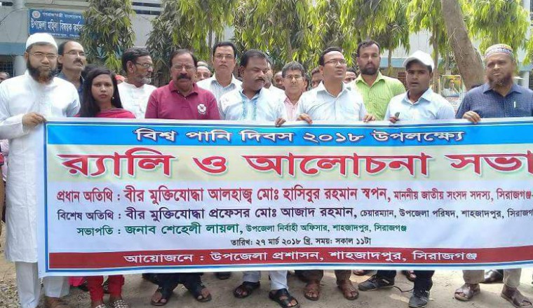 শাহজাদপুর প্রতিনিধি : সিরাজগঞ্জের শাহজাদপুরে বিশ্ব পানি দিবস পালিত হয়েছে। শাহজাদপুর উপজেলা প্রশাসনের উদ্যোগে আজ মঙ্গলবার (২৭ মার্চ) সকালে দিবসটি উপলক্ষে উপজেলা চত্ত্বর থেকে একটি শোভাযাত্রা বের করা হয়। শোভাযাত্রাটি পৌরসদরের গুরুত্বপূর্ণ সড়ক ঘুরে সেখানেই গিয়ে শেষ হয় । পরে উপজেলা পরিষদ শহিদ স্মৃতি মিলনায়তনে শাহজাদপুর উপজেলা নির্বাহী অফিসার শেহেলী লায়লার সভাপতিত্বে আলোচনা সভা অনুষ্ঠিত হয়। আলোচনা সভায় বক্তারা বলেন, প্রকৃতি ও মানব স্বাস্থ্যের জন্য নিরাপদ পানির কোন বিকল্প নেই। তাই এ ব্যাপারে সবাইকে আরও বেশি সচেতন হতে হবে। অনুষ্ঠানে প্রধান অতিথি ছিলেন আলহাজ হাসিবুর রহমান স্বপন এমপি , বিশেষ অতিথি হিসেবে ছিলেন, উপজেলা পরিষদ চেয়ারম্যান প্রফেসর আজাদ রহমান, কৃষি অফিসার মনজু আলম সরকার, পরিসংখান অফিসার মখলেছুর রহমান প্রমূখ ।