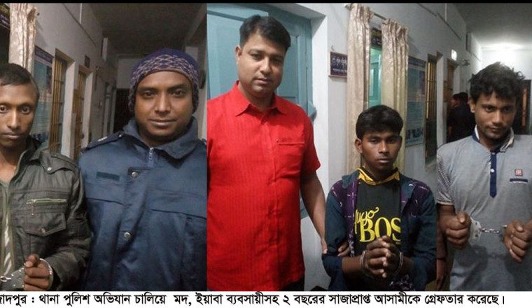 শামছুর রহমান শিশির : গত ২৪ ঘন্টায় শাহজাদপুর থানা পুলিশের বিশেষ অভিযানে ১৩ পিছ ইয়াবাসহ ১ ইয়াবা ব্যবসায়ী, ১২ লিটার চোলাই মদসহ ১ মদ ব্যবসায়ী ও ২ বছরের সাজাপ্রাপ্ত পলাতক অপর ১ আসামী গ্রেফতার হয়েছে। তাদের আজ শনিবার সিরাজগঞ্জ জেল হাজতে প্রেরণ করা হয়েছে। শাহজাদপুর থানা পুলিশ জানায়, গোপন সংবাদের ভিত্তিতে শাহজাদপুর থানার অফিসার ইনচার্জ খাজা গোলাম কিবরিয়া ও ওসি (তদন্ত) মনিরুল ইসলামের নির্দেশে গতকাল শুক্রবার রাত প্রায় ১০ টার দিকে থানার এসআই ইয়ামিন, এএসআই ফিরোজ, এএসআই কালাম (২) সঙ্গীয় ফোর্সসহ পৌরসদরের দ্বারিয়াপুর উত্তরপাড়া মহল্লায় অভিযান চালিয়ে একই মহল্লার আব্দুস সামাদের ছেলে ইয়াবা ব্যবসায়ী রতন (২৩) কে ১৩ পিছ ইয়াবাসহ হাতেনাতে গ্রেফতার করে। গ্রেফতারকৃত ইয়াবা ব্যবসায়ী রতনের বিরুদ্ধে থানায় মামলা হয়েছে। থানার এসআই ফারুক আজম, এএসআই আমজাদ হোসেন সঙ্গীয় ফোর্সসহ গোপন সংবাদের ভিত্তিতে উপজেলার পোতাজিয়া চন্দ্রপাড়া মহল্লায় অভিযান চালিয়ে ওই মহল্লার ফরিদ আলীর ছেলে মদ ব্যবসায়ী আলামিন (১৮) কে ১২ লিটার চোলাইমদসহ হাতেনাতে গ্রেফতার করে থানায় নিয়ে আসে। তার বিরুদ্ধে থানায় মামলা হয়েছে। এছাড়া, এসআই ফারুক আজম সঙ্গীয় ফোর্সসহ শুক্রবার রাত সাড়ে ১০ টায় পোতাজিয়া বাজার এলাকায় অভিযান চালিয়ে পৌরসদরের দ্বারিয়াপুর নতুন পাড়া মহল্লার আব্দুস সাত্তারের ছেলে ২ বছরের সাজাপ্রাপ্ত পলাতক আসামী রফিকুল ইসলাম (২৬) কে গ্রেফতার করে থানায় নিয়ে আসে। তাদের সবাইকে আজ শনিবার জেলহাজতে প্রেরণ করা হয়েছে।