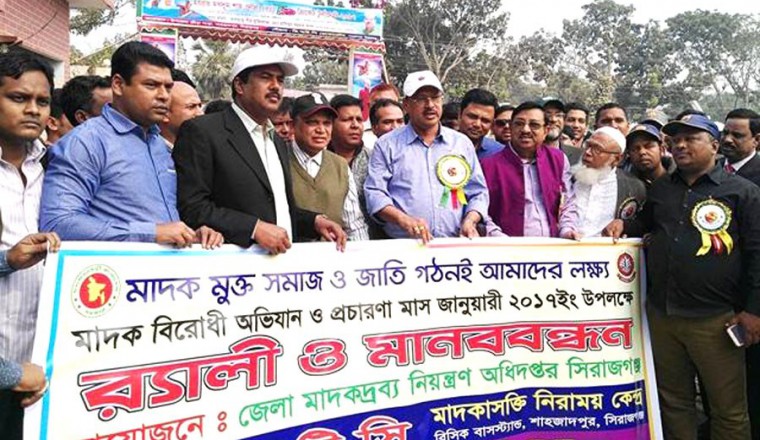 শামছুর রহমান শিশির/ফারুক হাসান কাহার : ‘মাদক মুক্ত সমাজ ও জাতি গঠনই আমাদের লক্ষ’- এ প্রতিপাদ্য বিষয়কে সামনে রেখে মাদক বিরোধী অভিযান ও প্রচারণা মাস জানুয়ারী ২০১৭ উপলক্ষে আজ শনিবার শাহজাদপুরে মাদক বিরোধী র্যালি ও পথসভা অনুষ্ঠিত হয়েছে। সিরাজগঞ্জ জেলা মাদকদ্রব্য নিয়ন্ত্রণ অধিদপ্তরের আয়োজনে ও প্রগতি সংঘের সহযোগিতায় পৌরসদরের প্রগতি সংঘ কার্যালয় থেকে মাদক বিরোধী র্যালি বের হয়ে পৌর শহরের গুরুত্বপূর্ণ সড়ক প্রদক্ষিণ শেষে সেখানেই শেষ হয়। প্রগতি সংঘের সভাপতি এনামুল হাসান মোজমালের সভাপতিত্বে অনুষ্ঠিত সংক্ষিপ্ত পথসভায় প্রধান অতিথি হিসেবে উপস্থিত ছিলেন স্থানীয় এমপি আলহাজ্ব হাসিবুর রহমান স্বপন। বিশেষ অতিথি ছিলেন উপজেলা পরিষদের ভাইস চেয়ারম্যান মুস্তাক আহমেদ, উপজেলা নির্বাহী অফিসার আলীমুন রাজীব, জেলা মাদকদ্রব্য নিয়ন্ত্রণ অধিদপ্তরের সহকারী পরিচালক নুরুল হক, উপজেলা দুর্নীতি প্রতিরোধ কমিটির সভাপতি এএম আব্দুল আজীজ, রবীন্দ্র গবেষক প্রফেসর নাছিম উদ্দিন মালিথা, পৌর আওয়ামী লীগের সাধারণ সম্পাদক আমিরুল ইসলাম শাহু, মাদকাশক্তি নিরাময় কেন্দ্র (ডিটিসি) এর নির্বাহী পরিচালক কামরুজ্জামান শাহীন, প্রগতি সংঘের সাধারণ সম্পাদক আসলাম হোসেন প্রমূখ। বক্তারা বলেন, ‘দেশকে সামনের দিকে এগিয়ে নিয়ে যেতে মাদক মুক্ত জাতি গঠনের কোন বিকল্প নেই। যে কোন মূল্যে মাদকের ভয়াবহ বিস্তার ও কড়াল গ্রাস থেকে শাহজাদপুরকে রক্ষা করতে সংশ্লিষ্টদের অগ্রণী ভূমিকা রাখতে হবে। সেইসাথে মাদকের ভয়াবহতা থেকে রক্ষায় জনসচেতনতা বৃদ্ধির ওপরও বক্তারা গুরুত্বারোপ করেন।