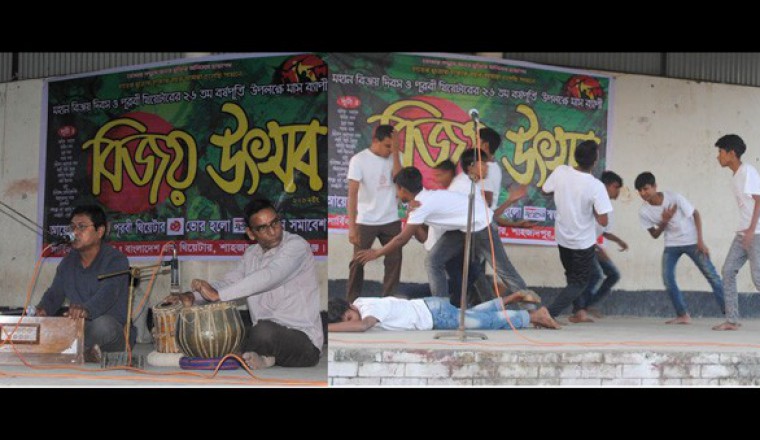 নিজস্ব প্রতিনিধিঃ শাহজাদপুরে মাস ব্যাপী বিজয় উৎসব-২০১৭ ইং শুরু হয়েছে। গতকাল শুক্রবার বিকেলে উপজেলার পৌর সদরের হাইস্কুল মাঠের মুক্ত মঞ্চে অনুষ্ঠিত এ বিজয় উৎসবের উদ্বোধন করেন বাংলাদেশ গ্রাম থিয়েটারের কেন্দ্রীয় পর্ষদের সাংগঠনিক সম্পাদক বিশিষ্ট নাট্যকার সাঈদ রিংকু। পূরবী থিয়েটারের সভাপতি বিশিষ্ট কবি ও সাহিত্যিক মমতাজ উদ্দিন শেখের সভাপতিত্বে অনুষ্ঠিত এ অনুষ্ঠানে বিশেষ অতিথি হিসাবে উপস্থিত ছিলেন, বাংলাদেশ গ্রাম থিয়েটারের কেন্দ্রীয় পর্ষদের আর্ন্তজাতিক বিষয়ক সম্পাদক বিশিষ্ট নাট্যকার ও নির্দেশক সৌজন্য অধিকারী, সিরাজগঞ্জ জেলার (রবীন্দ্র অঞ্চলের) প্রধান সমন্বয়কারী বিশিষ্ট কবি ও সাংবাদিক মোঃ মুমীদুজ্জামান জাহান, বিশিষ্ট সঙ্গীত শিল্পী আব্দুল মতিন, বাসদ নেতা আব্দুল আলীম, যুগান্তর স্বজন সমাবেশ শাহজাদপুর উপজেলা শাখার সভাপতি শাহবাজ খান সানি, পূরবী থিয়েটারের সহ সাধারণ সম্পাদক মেহেদী হাসান হিমু, সহকারী অধ্যাপক মাহবুবুর রহমান মিলন ও বিশিষ্ট তবলা বাদক দীপেশ চন্দ্র পাল। বাংলাদেশ গ্রাম থিয়েটারের ভ্রর্তৃপ্রতিম সংগঠন পূরবী থিয়েটার, শিশু সংগঠন ভোর হলো ও যুগান্তর স্বজন সমাবেশ শাহজাদপুর উপজেলা শাখা যৌথ ভাবে এ অনুষ্ঠানের আয়োজন করেছে। মাস ব্যাপী এ অনুষ্ঠানের মধ্যে রয়েছে, নাটক, ধূয়া গান, বাউল গান, শ্রীরূপ ক্ষ্যাপার গান, দেশের গান, কবিতা আবৃত্তি, নৃত্য, কবি আড্ডা, শাস্ত্র গান, আলোচনা সভা, মুক্তিযুদ্ধ ভিত্তিক চলচ্চিত্র গেরিলা ও বঙ্গবন্ধুর ৭ই মার্চের ভাষণ প্রদর্শন ইত্যাদি। এ বিজয় উৎসবের প্রথম দিন উদ্বোধনী অনুষ্ঠানে সাঈদ রিংকু রচিত ও নির্দেশিত নাটক ‘জাগো’ মঞ্চস্থ করা হয়। এ নাটকে অভিনয় করেন, মারুফ, নয়ন শেখ, রাকিব, আকরাম, শামীম, অনিক, আব্দুল আলীম, জাকারিয়া, ইমন, তুষার, ফরহাদ ও সোহাগ। এছাড়া ধূয়া গান,বাউল গান, দেশের গান ও কৌতুক পরিবেশন করা হয়। এ অনুষ্ঠানে স্বজন সদস্যদের মধ্যে উপস্থিত ছিলেন, আমিনুল ইসলাম, শরিফ, সানোয়ার হেসেন, অচিন্ত কুমার, মারুফ, নয়ন, রাসেল, নাহিন, শিমুল, পারভীন, হোসনেয়ারা, মীম, স্বাক্ষর, সোহেল, সজিব, জয়, অন্তর, সোনা মিয়া, মেঘ, তাকিবুন্নাহার, স্বর্ণ, মনতাজ আলী, ফিরজা খাতুন, ফরিদা খাতুন, ফারদিন, জায়েদ প্রমূখ।