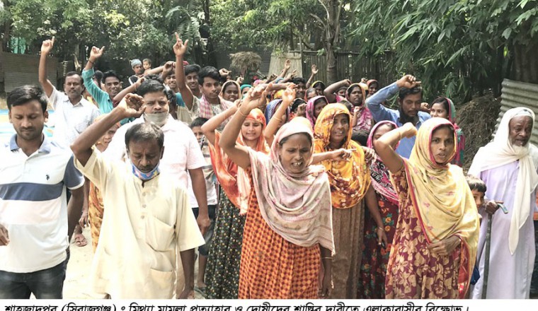 মিথ্যা হত্যা মামলা প্রত্যাহার, নিহত ৯ মাসের শিশু মাহমুদ ওরফে মাহিমের মা মুক্তা খাতুনের মুক্তি এবং প্রকৃত দোষীদের শাস্তির দাবীতে গতকাল সোমবার শাহজাদপুর উপজেলার পোরজনা ইউনিয়নের ছোট মহারাজপুর গ্রামে বিক্ষোভ ও মানববন্ধন কর্মসূচী পালন করেছে এলাকাবাসী। এদিন সকালে ছোট মহারাজপুর সরকারী প্রাথমিক বিদ্যালয় সংলগ্ন স্থানে বিক্ষুব্ধ এলাকাবাসী বিক্ষোভ প্রদর্শনপূর্বক মানববন্ধন কর্মসূচী পালনের মাধ্যমে এসব দাবী জানান। এ সময় এলাকাবাসী অভিযোগ করেন, ‘গত ২৮ এপ্রিল মঙ্গলবার রাতে একই ইউনিয়নের জোতপাড়া গ্রামে শিশু মাহমুদ ওরফে মাহিমের বাবা আব্দুল্লাহ, দাদা মকদম, দাদী পরিছন পরিকল্পিতভাবে শিশুটিকে হত্যা করে বিষয়টি ভিন্নখাতে প্রবাহের উদ্দেশ্যে শিশুর মা মুক্তা খাতুনের ওপর দোষ চাপিয়ে থানায় মিথ্যা মামলা করে। এ ঘটনার পর মুক্তা তার শিশুপুত্র হত্যার বিচার চাইতে থানায় আসলে পুলিশ তাকে গ্রেফতার করে জোরপূর্বক স্বীকারোক্তি নেয়। এ বিক্ষোভ ও মানববন্ধন কর্মসূচীর মাধ্যমে এসব ঘটনার তীব্র প্রতিবাদ জানিয়ে অবিলম্বে মিথ্যা হত্যা মামলা প্রত্যাহার, নিহতের নিদোর্ষ মা মুক্তার মুক্তি এবং মূলহোতা শিশুর বাবা আব্দুল্লাহ, দাদা মকদম, দাদী পরিছনকে গ্রেফতার করে দৃষ্টান্তমূলক শাস্তির দাবী জানাই’।