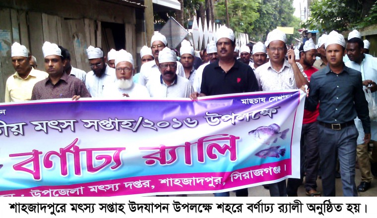নিজস্ব প্রতিনিধিঃ গতকাল বুধবার সকালে জাতীয় মৎস্য সপ্তাহ উদযাপন উপলক্ষে শাহজাদপুরে দিনব্যাপী নানা কর্মসূচী পালিত হয়েছে। শাহজাদপুর উপজেলা মৎস্য অধিদপ্তর আয়োজিত এ অনুষ্ঠানমালার মধ্যে ছিল বর্ণাঢ্য র্যালী, মৎস্য অবমুক্ত করণ, আলোচনা সভা ও জন সচেতনতা মূলক বিশেষ প্রচার ও প্রচারনা। র্যালীটি স্থানীয় মৎস্য অফিস থেকে শুরু হয়ে শহর প্রদক্ষিন শেষে উপজেলা চত্ত্বরে শেষ হয়। এরপর উপজেলা পরিষদ পুকুরে মাছের পোনা অবমুক্ত করা হয়। উপজেলা হল রুমে আয়োজিত আলোচনা সভায় বক্তব্য রাখেন, উপজেলা চেয়ারম্যান প্রফেসর আজাদ রহমান, ভাইস চেয়ারম্যান মুস্তাক আহমেদ, প্রফেসর নাছিম উদ্দিন মালিথা, প্রফেসর আব্দুল আজিজ, কৃষি অফিসার মঞ্জু আলম, ভারপ্রাপ্ত মৎস্য কর্মকর্তা এস,এম জাহাঙ্গীর আলম, সফল মৎস্য চাষী কে এম নাছির উদ্দিন প্রমুখ। এতে সভাপতিত্ব করেন উপজেলা নির্বাহী অফিসার শামীম আহমেদ। সবশেষে মৎস্য চাষে এলাকাবাসীকে উদ্বুদ্ধ করতে দিনভর ব্যাপক প্রচার ও প্রচারনা চালানো হয়।