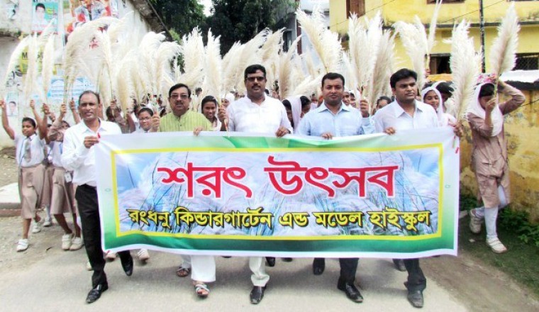 শাহজাদপুর প্রতিনিধিঃ সিরাজগঞ্জ জেলার তাঁতসমৃদ্ধ শাহজাদপুরের ঐতিহ্যবাহী রংধনু কিন্ডার গার্টেন এন্ড মডেল হাইস্কুলের উদ্যোগে গতকাল সোমবার শরৎ উৎসব পালন উপলক্ষে এক বর্ণাঢ্য র্যালি শহর প্রদক্ষিন করে। কাঁশফুল হাতে নিয়ে শত শত শিক্ষক-শিক্ষার্থী, সূধীমহল ওই র্যালিতে অংশ নিলে এক অপূর্ব দৃশ্যের সৃষ্টি হয়। বিরল ওই দৃষ্টিনন্দন র্যালি বের হলে উদ্যোক্তাসহ অংশগ্রহনকারীদের সবাইকে শাহজাদপুরবাসী এ সময় স্বাগত জানায়। র্যালিটি রংধনু কিন্ডার গার্টেন এন্ড মডেল হাইস্কুল থেকে বের হয়ে পৌরসদরের প্রধান প্রধান সড়ক প্রদক্ষিণ শেষে স্থানীয় রবীন্দ্র কাছারিবাড়ি প্রাঙ্গণে শেষ হয়। পরে রবীন্দ্র কাছারিবাড়ি মিলনায়তনে বিশিষ্ট রবীন্দ্র গবেষক প্রফেসর নাছিম উদ্দিন মালিথার সভাপতিত্বে অনুষ্ঠিত এক আলোচনা সভায় অন্যান্যের মধ্যে বক্তব্য রাখেন, শাহজাদপুর উপজেলা নির্বাহী অফিসার শামীম আহমেদ, সহকারি পুলিশ সুপার (শাহজাদপুর সার্কেল) আবুল হাসনাত, উপজেলা পরিষদের ভাইস চেয়ারম্যান মুস্তাক আহমেদ, সহকারী কমিশনার (ভূমি) মোঃ আরিফুজ্জামান, রংধনু কিন্ডার গার্টেন এন্ড মডেল হাইস্কুলের অধ্যক্ষ শহীদুল ইসলাম শাহীন, সিনিয়র শিক্ষক মঈন উদ্দিন, সন্তোষ বসাক, শ্যামল দত্ত, আশরাফুজ্জামান প্রমূখ। শরতের আগমনীতে বিরল অপূর্ব এ আয়োজন শাহজাদপুরবাসীকে মুগ্ধ করে।
