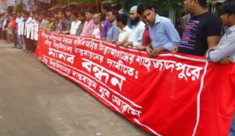 রবীন্দ্র বিশ্ববিদ্যালয় বাস্তবায়ন যুব ফোরামের আহবায়ক মোস্তাফিজুর রহমান সাবায়েতের সভাপতিত্ত্বে মানব বন্ধন কর্মসূচিতে অন্যানের মধ্যে বক্তব্য রাখেন, রবীন্দ্র বিশ্ববিদ্যালয় বাস্তবায়ন যুব ফোরামের উপদেষ্টাআসাদ উল্লাহ তুষার , মীর আব্দুল্লাহ আল আমিন রঞ্জন, হাসান আল মামুন ,যুব ফোরামের সদস্য সচিব আলিমুল আল সজীব , সোহান , শাহিন , রনি, শান্ত, রিজভী প্রমুখ ।