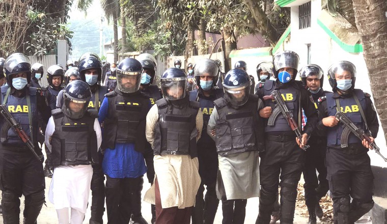শামছুর রহমান শিশির ও মিঠুন বসাক : শুক্রবার সকালে সিরাজগঞ্জের শাহজাদপুর পৌরসভার শেরখালী উকিলপাড়া এলাকায় জঙ্গি আস্তানা সন্দেহে উপ সহকারী প্রকৌশলী (ফ্যাসিলিটিজ) শামসুল হক রাজার বাড়ি থেকে সিরাজগঞ্জ র‌্যাপিড অ্যাকশন ব্যাটালিয়ন (র‌্যাব-১২) জেএমবির আঞ্চলিক প্রধান (পাবনা-সিরাজগঞ্জ) কিরণসহ জেএমবির চার সক্রিয় সদস্যকে আটক করেছেন। এরা হলেন পাবনা সাথিয়ার নাইমুল ইসলাম , দিনাজপুরের আতিয়ার রহমান, সাতক্ষিরার আমিনুল ইসলাম শান্ত। তাদের আস্তানা থেকে ২টি পিস্তল একটি চাপাতি, বোমা তৈরীর সরঞ্জামাদী ও জিহাদী বই উদ্ধার করা হয়েছে। কিরন একাধিক ছদ্ম নাম ব্যবহার করতেন বলে র‌্যাবের অতিরিক্তি মহা পরিচালক (অপারেশন) কর্ণেল তোফায়েল মোস্তফা সারোয়ার প্রেস ব্রিফিং এ এ কথা জানান। তিনি আরো জানান, মাদক সন্ত্রাস জঙ্গিবাদের বিরুদ্ধে সরকারের জিরো টলারেন্স নীতির অংশ হিসেবে গত বৃহস্পতিবার রাত ১১টায় রাজশাহীর শাহ মখদুম এলাকায় এক জঙ্গি বিরোধী অভিযানে মাহমুদ, জুয়েল ও আশরাফুলকে আটক করা হয়। তাদের দেয়া তথ্যের ভিত্তিতে এদিন রাত ২ টার দিকে র‌্যাবের একটি দল শাহজাদপুর উপজেলা সদরের উকিলপাড়া একটি বাড়ি ঘিরে রাখে। জঙ্গিরা র‌্যাবের উপস্থিতি টের পেয়ে ভোরে পিস্তলের গুলি ছোঁড়ে। এ সময় এ অভিযানে শাহজহাদপুর থানা পুলিশ সহযোগিতা করেন। বৃহস্পতিবার রাত ২টার পর থেকে এই বাড়িটিতে জঙ্গিদের আস্তানা রয়েছে এমন খবরে র‌্যাব-১২ ঘিরে রাখে। শুক্রবার সকালে এ তথ্য নিশ্চিত করেন র‌্যাব-১২’র কোম্পানি কমান্ডার মিরাজউদ্দিন। সকাল সাড়ে ৯ টার দিকে র‌্যাবের বোমা ডিসপোজাল ইউনিট ওই আস্তনায় প্রবেশ করলে কিরণ, নাইমুল, আতিয়ার ও আমিনুল ইসলাম শান্ত সহ চারজন জঙ্গি বেড়িয়ে এসে র‌্যাবের হাতে ধরা দেন। র‌্যাব-১২ এর কোম্পানি কমান্ডার মিরাজউদ্দিন জানান, চলতি মাসের ৫ তারিখে ছাত্র পরিচয়ে ওই বাড়িটি ভাড়া নিয়ে জঙ্গি ও সন্ত্রাসী কার্যক্রম চালিয়ে আসছিল এমন সংবাদের ভিত্তিতে গত বৃহস্পতিবার দিবাগত রাত ২টা থেকে বাড়িটি ঘিরে রাখা হয়। এরই মধ্যে র‌্যাবের উপস্থিতি টের পেয়ে ওই বাড়ির ভেতর থেকে গুলি ছোঁড়া হয়েছে। তবে কোন হতাহতের ঘটনা ঘটেনি। হ্যান্ড মাইকে র‌্যাবের পক্ষ থেকে জঙ্গিদের আত্মসমর্পণ করতে বলা হয়। বেলা ১০ টার মধ্যে আত্মসমর্পণের জন্য সময় বেধে দেয়া হয়। এর আগেই সকাল সাড়ে নয়টায় জঙ্গিরা আত্মসমর্পণ করে। এ খবরে সকাল নয়টার দিকে র‌্যাব সদরদপ্তর থেকে হেলিকপ্টারযোগে শাহজাদপুরে আসেন র‌্যাবের অতিরিক্ত মহা পরিচালক (অপারেশন) কর্ণেন তোফায়েল মোস্তফা সরোয়ার। আটককৃত জঙ্গিদের র‌্যাবের সদর দপ্তরে নেওয়া হয়েছে। জিজ্ঞাসাবাদ শেষে এদেরকে শাহজাদপুর থানা পুলিশের কাছে হস্তান্তর করা হবে। স্থানীয় বাসিন্