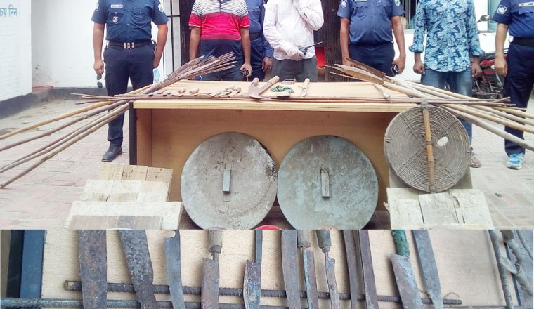 আজ শনিবার দুপুরে গোপন সংবাদের ভিত্তিতে শাহজাদপুর উপজেলার কৈজুরী ইউনিয়নের পূর্ব চর কৈজুরী গ্রামে দুই গ্রুপের সংঘর্ষের প্রস্তুতিকালে অভিযান চালিয়ে বিপুল পরিমান দেশীয় অস্ত্রসস্ত্র উদ্ধার করেছে শাহজাদপুর থানা পুলিশ। উদ্ধারকৃত দেশীয় অস্ত্রসস্ত্রের মধ্যে রয়েছে রামদা, ছোঁড়া, টেটা, ফালা, হলঙ্গা, বল্লম, চাকু, চাপাতি, লোহার রড। এ বিষয়ে শাহজাদপুর থানার অফিসার ইনচার্জ আতাউর রহমান প্রেস ব্রিফিংয়ে জানান, ‘উপজেলার কৈজুরী ইউনিয়নের পূর্ব চর কৈজুরী গ্রামে সংঘর্ষের প্রস্তুতিকালে গোপন সংবাদের ভিত্তিতে শাহজাদপুর থানা পুলিশ ৪টি দলে বিভক্ত হয়ে ওই গ্রামে অভিযান চালায়। এ সময় দুই গ্রুপের সমর্থকদের বাড়ি বাড়ি তল্লাশি করে এসব দেশীয় অস্ত্রসস্ত্র উদ্ধার করা হয়। ভবিষ্যতেও যে কোন ধরনের সংঘর্ষ এড়াতে এ ধরনের অভিযান অব্যাহত থাকবে।