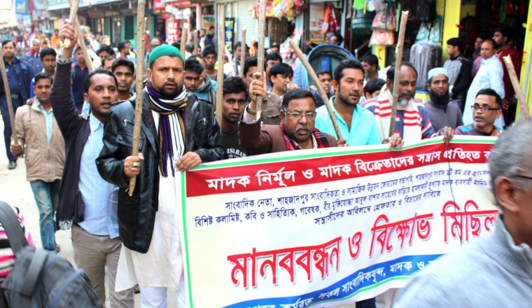 নিজস্ব প্রতিনিধি: স্থানীয় প্রবীণ সাংবাদিক, কলামিষ্ট, গবেষক ও মুক্তিযোদ্ধা আবুল বাশারের বাড়িতে হামলার ঘটনায় স্থানীয় সাংবাদিক নেতাদের বেঁধে দেয়া সময়ের মধ্যে ঘটনার মূল হোতা কুখ্যাত মাদক ব্যবসায়ী মানিক সরকার ও তার সহযোগীদের পুলিশ গ্রেফতার করতে না পারায় আজ শুক্রবার শাহজাদপুরে মানববন্ধন ও লাঠি মিছিল করেছে স্থানীয় সংবাদকর্মীরা। শাহজাদপুরে কর্মরত সাংবাদিক এবং মাদক ও সন্ত্রাস বিরোধী জোট এ কর্মসূচীর আয়োজন করে। এদিন সকালে পৌরসদরের শাহজাদপুর-এনায়েতপুর সড়কের ভাষা সৈনিক ডাঃ বুলবুল চত্বরে প্রায় ঘন্টাব্যাপী এ মানববন্ধন কর্মসূচী পালন করা হয়। এতে স্থানীয় গণমাধ্যমকর্মী, রাজনৈতিক, সামাজিক, সাংস্কৃতিক ও পেশাজীবী সংগঠনের নেতৃবৃন্দসহ সর্বস্তরের মানুষ অংশ নেয়। মানববন্ধন কর্মসূচী চলাকালে সাংবাদিক নেতা,শাহজাদপুর সংবাদ ডটকমের প্রধান সম্পাদক, শাহজাদপুর সাংবাদিকতা ও সামাজিক উন্নয়ন ফোরামের সভাপতি, বীর মুক্তিযোদ্ধা আবুল বাশারের বাড়িতে হামলার নিন্দা এবং কুখ্যাত মাদক ব্যবসায়ী মানিক সরকার ও তার সহযোগীদের অবিলম্বে গ্রেফতারের দাবি জানিয়ে বক্তব্য রাখেন, স্থানীয় দুর্নীতি প্রতিরোধ কমিটির সভাপতি অধ্যক্ষ এএম আব্দুল আজীজ, সাধারণ সম্পাদক প্রফেসর নাছিম উদ্দিন মালিথা, শাহজাদপুর প্রেসক্লাবের সভাপতি বিমল কুন্ডু, সাধারণ সম্পাদক শফিকুজ্জামান শফি, উপজেলা আইনজীবী সমিতির সভাপতি এড. আনোয়ার হোসেন, বাসদ নেতা এড. মতিয়ার রহমান, সাংবাদিক নেতা ও ভোরের কাগজ প্রতিনিধি কবীর আজমল বিপুল, নয়াদিগন্ত সংবাদদাতা আবুল কাশেম, সমকাল রিপোর্টার আব্দুল হাকিম শিমুল, প্রতিদিনের সংবাদ এর প্রতিনিধি হাসানুজ্জামান তুহিন,জনকন্ঠের সৈয়দ হুমায়ুন পারভেজ শাব্বির, উপজেলা জাসদের সাধারণ সম্পাদক আবু হাসান খান মনি, সাংবাদিকতা ও সামাজিক উন্নয়ন ফোরামের সাধারণ সম্পাদক, খবরপত্র প্রতিনিধি শফিকুল ইসলাম ফারুক, সহ-সভাপতি দিলকাল প্রতিনিধি আল আমিন হোসেন, যুগ্ম-সাধারণ সম্পাদক মামুন রানা, যুগ্ম-সাধারণ সম্পাদক শামছুর রহমান শিশির, জাতীয় ও আঞ্চলিক পত্রিকার স্থানীয় এজেন্ট সন্তোষ কুমার সাহা, সম্মিলিত সাংস্কৃতিক জোট নেতা কোরবান আলী খান লাভলু, সার্কেল শাহজাদপুর গ্রুপ নির্বাহী রাজীব রাসেল প্রমূখ। বক্তারা বলেন, ‘ শাহজাদপুর সরকারি কলেজ সংলগ্ন পৌর মার্কেটে দীর্ঘদিন ধরে মাদক ব্যবসার দায়ে ৫ বছরের দন্ডপ্রাপ্ত মানিক সরকার ও তার পিতা রতন সরকার মাদকদ্রব্য নিয়ন্ত্রণ অধিদপ্তরের ছত্রছায়ায় অবৈধভাবে মাদকদ্রব্য বিক্রি করে আসছে। এই পিতা-পুত্র পৌরসদরের ১০টি পয়েন্টসহ উপজেলার বিভিন্ন স্থানে অর্ধ শতাধিক ভ্রাম্যমান প্রতিনিধির মাধ্যমে মাদক ব্যবসা ছড়িয়ে দিয়ে অবৈধভাবে কোটি কোটি টাকার মাল