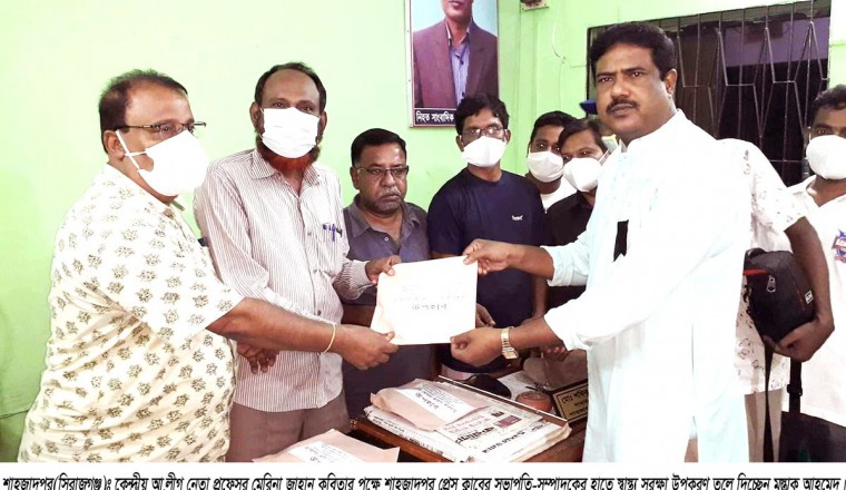 করোনার ক্রান্তিকালে বাংলাদেশ আওয়ামী লীগ কেন্দ্রীয় কার্যনির্বাহী কমিটির অন্যতম সদস্য, রাবির সাবেক ভিসি প্রফেসর ড. মযহারুল ইসলামের কন্যা প্রফেসর মেরিনা জাহান কবিতা শাহজাদপুরে কর্মরত সকল প্রিন্ট ও ইলেকট্রনিক মিডিয়ার সাংবাদিকদের স্বাস্থ্য সুরক্ষা নিশ্চিতে স্বাস্থ্য উপরকণ প্রদান করেছেন। গতকাল বুধবার রাতে প্রফেসর মেরিনা জাহান কবিতার পক্ষ থেকে সাবেক ভাইস চেয়ারম্যান ও উপজেলা আ.লীগের সাংগঠনিক সম্পাদক মুস্তাক আহমেদ এসব স্বাস্থ্য উপকরণ শাহজাদপুর প্রেস ক্লাবের সভাপতি বিমল কুন্ডু ও সাধারন সম্পাদক শফিকুজ্জামান শফির হাতে তুলে দেন। এরপর প্রেস ক্লাব শাহজাদপুর এর সভাপতি আতাউর রহমান পিন্টু ও সাধারন সম্পাদক ওমর ফারুকের হাতেও স্বাস্থ্য সুরক্ষার নানা উপকরণ তুলে দেন মুস্তাক আহমেদ। এ স্বাস্থ্য সুরক্ষার উপকরণ বিতরণকালে শাহজাদপুরে কর্মরত বিভিন্ন প্রিন্ট ও ইলেকট্রনিক মিডিয়ার সাংবাদিকবৃন্দ উপস্থিত ছিলেন। এ বিষয়ে প্রফেসর মেরিনা জাহান কবিতা বলেন, ‘করোনার কান্তিকালেও সাংবাদিকেরা ঝুঁকি নিয়ে দেশ ও জাতির কল্যাণে কাজ করে যাচ্ছেন। তাদের স্বাস্থ্য সুরক্ষার জন্যই আমার এ ক্ষুদ্র উপহার।’
