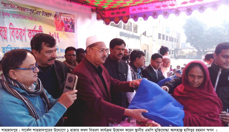 শামছুর রহমান শিশির/ফারুক হাসান কাহার : আজ শনিবার সকালে আর্তমানবতার কল্যাণে নিয়োজিত স্থানীয় সেবামুলক অরাজনৈতিক সংগঠন ও ফেসবুক গ্রুপের উদ্যোগে প্রধান অতিথি হিসেবে উপস্থিত থেকে এলাকার দুস্থ অসহায় শীতার্তদের মধ্যে কম্বল বিরতণ করলেন স্থানীয় এমপি বীর মুক্তিযোদ্ধা আলহাজ্ব হাসিবুর রহমান স্বপন। পরে অতিথিবৃন্দকে সাথে নিয়ে সার্কেল শাহজাদপুর সংগঠন ও ফেসবুক গ্রুপ নির্বাহী ও এডমিন রাজীব রাসেল, এডমিন ফারুক হাসান কাহার, মর্ডারেটর সাংবাদিক শামছুর রহমান শিশির ও মর্ডারেটর এম এ হান্নান শেখসহ গ্রুপের সদস্যবৃন্দ স্থানীয় ১ হাজার দুস্থ শীতার্ত মানুষের মধ্যে শীতবস্ত্র বিতরণ করেন। শাহজাদপুর সরকারি কলেজ মাঠে এ উপলক্ষ্যে আয়োজিত সভায় সভাপতিত্বে করেন সার্কেল শাহজাদপুরের উপদেষ্টা, স্থানীয় সাংবাদিক নেতা, বিশিষ্ট কলামিষ্ট, কবি, সাহিত্যিক বীর মুক্তিযোদ্ধা আবুল বাশার। স্থানীয় এমপি, সাবেক শিল্প-উপমন্ত্রী ও উপজেলা আওয়ামী লীগ সভাপতি আলহাজ্ব হাসিবুর রহমান স্বপন প্রধান অতিথির বক্তব্যে বলেন, ‘ জনকল্যাণে নিয়োজিত সংগঠন ও স্থানীয় সর্ববৃহত ফেসবুক গ্রুপ সার্কেল শাহজাদপুর এলাকার দুস্থ অসহায়দের কল্যাণে যেসব কার্যক্রম চালিয়ে যাচ্ছে তা নিঃসন্দেহে প্রশংসার দাবীদার। তারা আগামীতে স্বচ্ছতার সাথে সুচারুরুপে জনকল্যাণে আরও সেবামূলক কার্যক্রম চালিয়ে যাবে বলে তিনি আশাবাদী। এ জন্য তার পক্ষ থেকে সব ধরনের সহযোগিতা প্রদান করা হবে। এছাড়া সার্কেল শাহজাদপুরের সকল সেবামুলক কার্যকমে এলাকার বিত্তবানদের এগিয়ে আসার আহবান জানান। ’ সার্কেল শাহজাদপুরের পক্ষ থেকে শাহজাদপুরে একটি ব্লাডব্যাংক স্থাপনের যে দাবি উঠেছে তার সাথে সকল বক্তারা একাত্বতা প্রকাশ করে স্থানীয় এমপি আলহাজ্ব হাসিবুর রহমান স্বপন আরও বলেন, ‘শাহজাদপুরে অচিরেই একটি ব্লাডব্যাংক স্থাপন করা হবে। এ বিষয়টি সিরাজগঞ্জের কৃতী সন্তান স্বাস্থ্যমন্ত্রী আলহাজ্ব মোহাম্মদ নাসিমের নিকট অতিসত্ত্বর উপস্থাপন করবেন। ওই অনুষ্ঠানে বিশেষ অতিথি হিসেবে বক্তব্য রাখেন, শাহজাদপুর সরকারি কলেজের অধ্যক্ষ মো: আলী হায়দার রেজা তালুকদার, বিশিষ্ট শিক্ষাবিদ শাহজাদপুর সরকারি কলেজের সাবেক অধ্যক্ষ এএম আব্দুল আজীজ, রবীন্দ্র গবেষক প্রফেসর নাছিম উদ্দিন মালিথা, সার্কেল শাহজাদপুরের উপদেষ্টা শাহজাদপুর প্রেসক্লাবের সাধারণ সম্পাদক শফিকুজ্জামান শফি, শাহজাদপুর উপজেলা পরিষদের ভাইস চেয়ারম্যান মুস্তাক আহমেদ, পৌর আওয়ামী লীগের সাধারণ সম্পাদক আমিরুল ইসলাম শাহু, শাহজাদপুর সাংবাদিকতা ও সামাজিক উন্নয়ন ফোরামের সাধারণ সম্পাদক শফিকুল ইসলাম ফারুক, সিনিয়র সহ-সভাপতি,দিনকাল প্রতিনিধি আল-আমিন হোসেন, যুগ্ম-সাধারণ সম্পাদক মামুন রানা, আশি