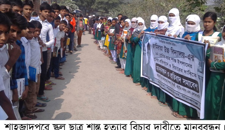 নিজস্ব প্রতিনিধিঃ সিরাজগঞ্জের শাহজাদপুর উপজেলার জামিরতা উচ্চ বিদ্যালয়ের নবম শ্রেণীর ছাত্র শান্ত ইসলাম (১৪) হত্যার বিচার দাবীতে মানববন্ধন ও সমাবেশ অনুষ্ঠিত হয়েছে। গত শনিবার দুপুরে এ বিদ্যালয়ের প্রায় ২ হাজার ছাত্র-ছাত্রী, শিক্ষক-কর্মচারী ও এলাকাবাসী সমবেত হয়ে এ মানববন্ধন ও সমাবেশ করেন। শান্ত ইসলামের পরিবার সূত্রে জানা যায়, গত ১৮ অক্টোবর ২০১৬ ইং তারিখে জামিরতা বাজারের ১টি কম্পিটারের দোকান থেকে শান্ত ইসলামের ঝুলন্ত লাশ পুলিশ উদ্ধার করে। ময়না তদন্তের রির্পোট থেকে জানা যায়, তাকে পরিকল্পিত ভাবে শ্বাসরোধে হত্যা করা হয়েছে। এ ব্যাপারে শাহজাদপুর থানায় শান্ত ইসলামের বাবা মোঃ ছানোয়ার হোসেন বাদী হয়ে ৫ জনের নাম উল্লেখ করে মামলা দায়ের করেন। এ মামলায় আসামী মোঃ আদম ও শহীদ গ্রেফতার হলেও আবু সাইদ মাস্টার, আব্দুল কাদের ও আকলিমা খাতুন এখনো পলাতক রয়েছে। পলাতক আসামীদের দ্রুত গ্রেফতার করে বিচারের দাবীতে জামিরতা বাজারে মানববন্ধন ও সমাবেশ করেন বিদ্যালয়ের শিক্ষক, শিক্ষার্থী, কর্মচারী ও এলাকাবাসী। সমাবেশে বক্তব্য রাখেন, জামিরতা উচ্চ বিদ্যালয়ের প্রধান শিক্ষক মোজাম্মেল হক, সহকারি শিক্ষক আব্দুল মুমিন, ১০ম শ্রেণির ছাত্রী আমিনা খাতুন, শান্ত ইসলামের সহপাঠী গোলাম রাব্বি প্রমুখ। সমাবেশে বক্তারা বলেন, শান্ত হত্যার বিচার দাবী করে বক্তব্য রাখেন।