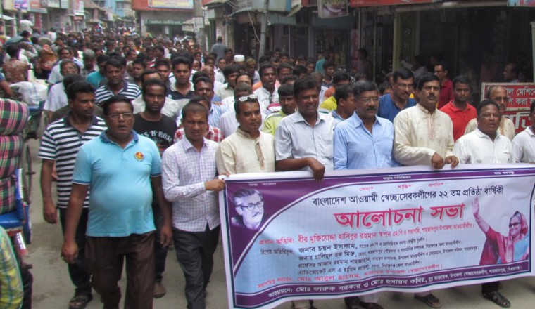 শাহজাদপুর উপজেলা সংবাদদাতাঃ সিরাজগঞ্জের শাহজাদপুরে বাংলাদেশ আওয়ামী স্বেচ্ছাসেবক লীগের ২২ তম প্রতিষ্ঠা বার্ষিকী পালিত হয়েছে। আওয়ামী স্বেচ্ছাসেবক লীগ শাহজাদপুর উপজেলা শাখার উদ্যোগে বুধবার সকালে শহরে এক বর্ণাঢ্য র্যালী বের করে। র্যালি শেষে দলীয় কার্যালয়ে স্বেচ্ছা সেবক লীগের আহবায়ক আবুল হোসেনের সভাপতিত্বে অনুষ্ঠিত উক্ত আলোচনা সভায় প্রধান অতিথি হিসাবে বক্তব্য রাখেন, শাহজাদপুর পৌরসভার মেয়র ও সিরাজগঞ্জ জেলা আওয়ামী লীগের সাংগঠনিক সম্পাদক হালিমুল হক মিরু, ভাইস চেয়ারম্যান মুস্তাক আহমেদ, পৌর আওয়ামী লীগের সাধারণ সম্পাদক আমিরুল ইসলাম শাহু, স্বেচ্ছাসেবক লীগের যুগ্ম আহবায়ক ফারুক সরকার, পৌর স্বেচ্ছাসেবক লীগের সাধারণ সম্পাদক আব্দুল বাছেদ, রাজিব শেখ, স্বেচ্ছাসেবক লীগ নেতা মহির উদ্দিন, মির্জা রাজু আহমেদ, বাবর আলী, সিরাজুল ইসলাম শিপু, গোলজার হোসেন, আনোয়ার হোসেন প্রমূখ। আলোচনা সভায় বক্তারা বলেন, ‘যে কোন মূল্যে দেশ থেকে জঙ্গিবাদ নির্মূল করা হবে। এ জন্য দলীয় নেতাকর্মী, সমর্থকসহ সকলের সার্বিক সহযোগীতা কামনা করেন।উক্ত অনুষ্ঠানে আওয়ামী লীগ, স্বেচ্ছাসেবক লীগ ও সকল অঙ্গ ও সহযোগী সংগঠনের নেতৃবৃন্দ উপস্থিত ছিলেন। র্যালি ও আলোচনা শেষে মিষ্টি বিতরণ করা হয়।