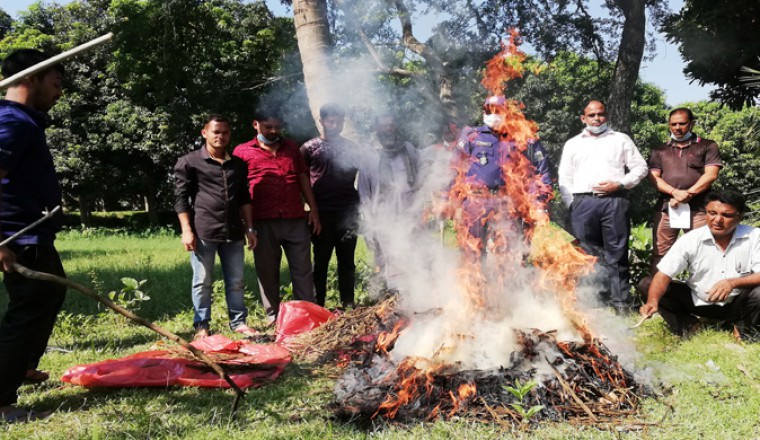 দুটি মামলার ধ্বংসকৃত মাদকদ্রব্যের আলামত ৪০ কেজি গাজা ও আটশত বাহাত্তর (৮৭২) পিচ ইয়াবা সিনিয়ার জুডিসিয়াল ম্যাজিস্ট্রেট আদালত প্রাঙ্গণে আগুনে পুড়িয়ে ধ্বংস করা হয়।